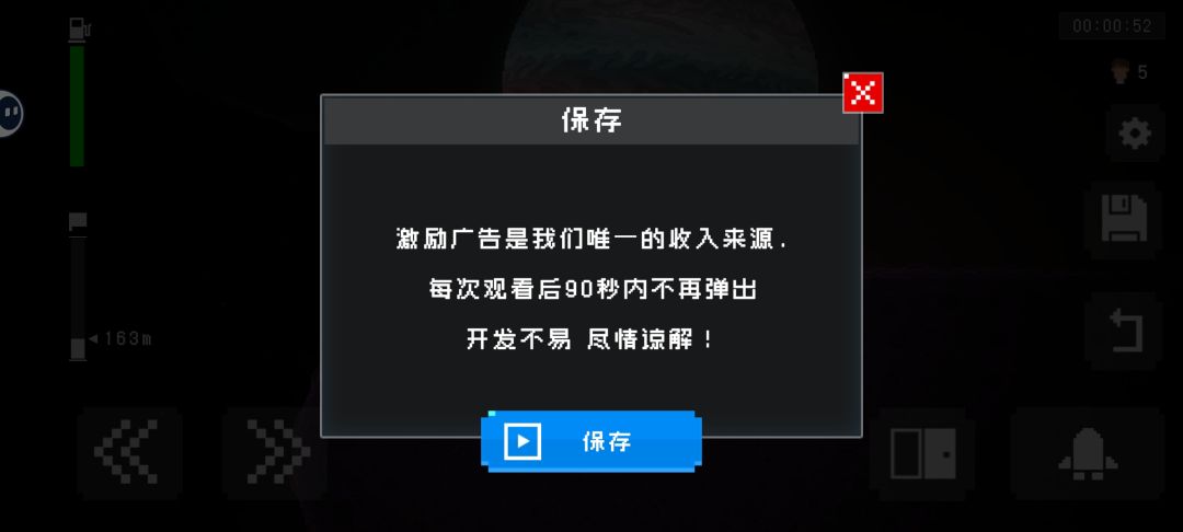 不看广告不能存档,不存档的话很容易卡关。看完广告90秒内存档不用再看广告,超出90秒再存档又需要看广告。免费游戏弹广告理解,但是这也太频繁了。吃相很难看😢
