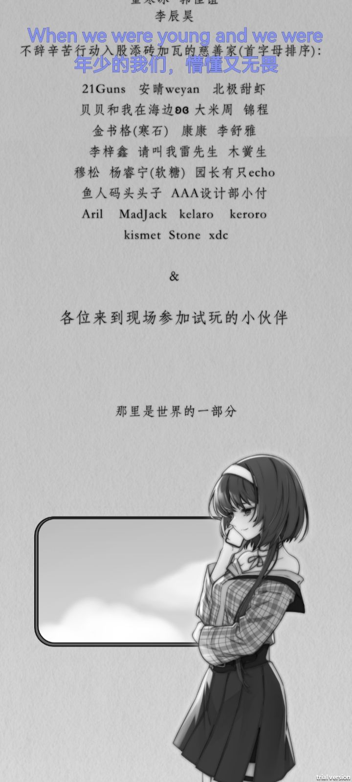 这游戏要大脑,不是简单的剧情,需要一定的思考(对我这个几乎不用脑子玩游戏的人来说,非常的不友好)😠(友军误杀)!!!🤔谜题设计:非常有趣🧝🏻♀️角色人设:符合正常思维🕵️剧情分析:有点受不了,但还行。🎮可玩性:可以模仿音游,把歌做成音乐吗,别光这一个剧情啊。😞(虽然说也还行)🌃画面音乐:非常好,如果有官方给的高清图就更好了✍🏻建议:高清图,可以的话,有动态吗?