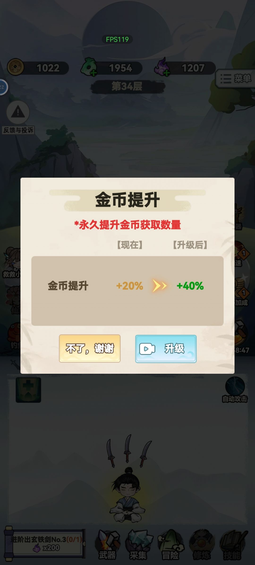 游戏就是点点点,自动出飞剑打怪。只有攻击,没有防御,打不过是飞剑没耐久度,既攻击不够。