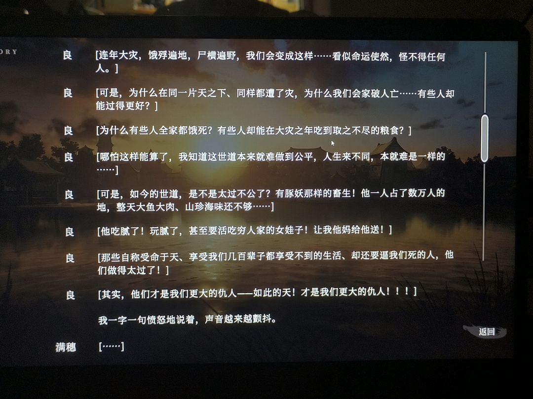 在steam上面推完了所有结局,进度100%,剧情真的震撼到我了,已经封神了,全篇围绕了中国人自古以来最重要的一个问题,那就是吃饭问题,先说说剧情吧,共死这个结局是我认为最悲壮的,也是我最喜欢的,男女主诛杀了恶人,最后却被为虎作伥的太监箭杀,讽刺又荒唐,历史书上短短几行的人相食,游戏里面体现的淋漓尽致,可这些,在游戏里只是一个可悲的常态,世道是不公的,逼良从匪,饥民食人,连年大旱,皇帝十年不上朝,王爷处处纳粮,玩腻了,吃腻了,甚至还要活吃小孩,让人帮他去送,这些文字看得我触目惊心,大受震撼,第一次玩这种历史类题材的galgame,但是也是我最难忘的一次,感谢零创能让我知道,有这样的游戏,希望零创还能出后续,我真的很想知道其他人的命运😭😭😭😭