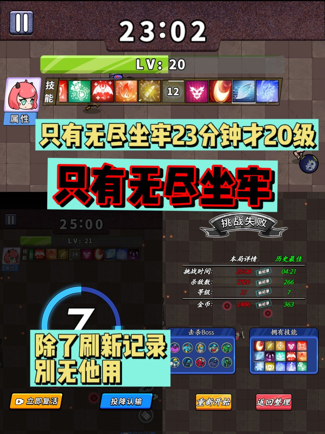 可见图2,死亡的时候21级,已经游玩足足25分钟了,后面升级速度极慢,而且怪物还稀疏,就更慢了——甚至都没有让我看广告使用磁铁的想法,就那三瓜两枣的技能点,一级都升不上去,其他游戏起码磁铁都能突突升三级的。