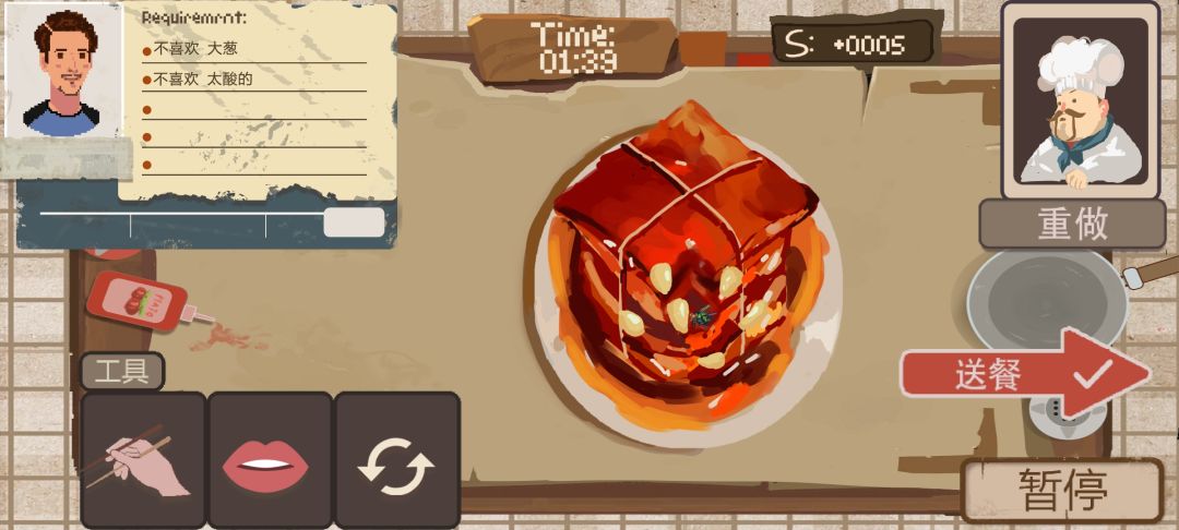 2D画风,画面品质一般,界面并不多,功能逻辑比较清晰。画面表现力一般,很多食材模模糊糊看不清。部分效果表达还可以,比如厨师表情,很容易判断对错。