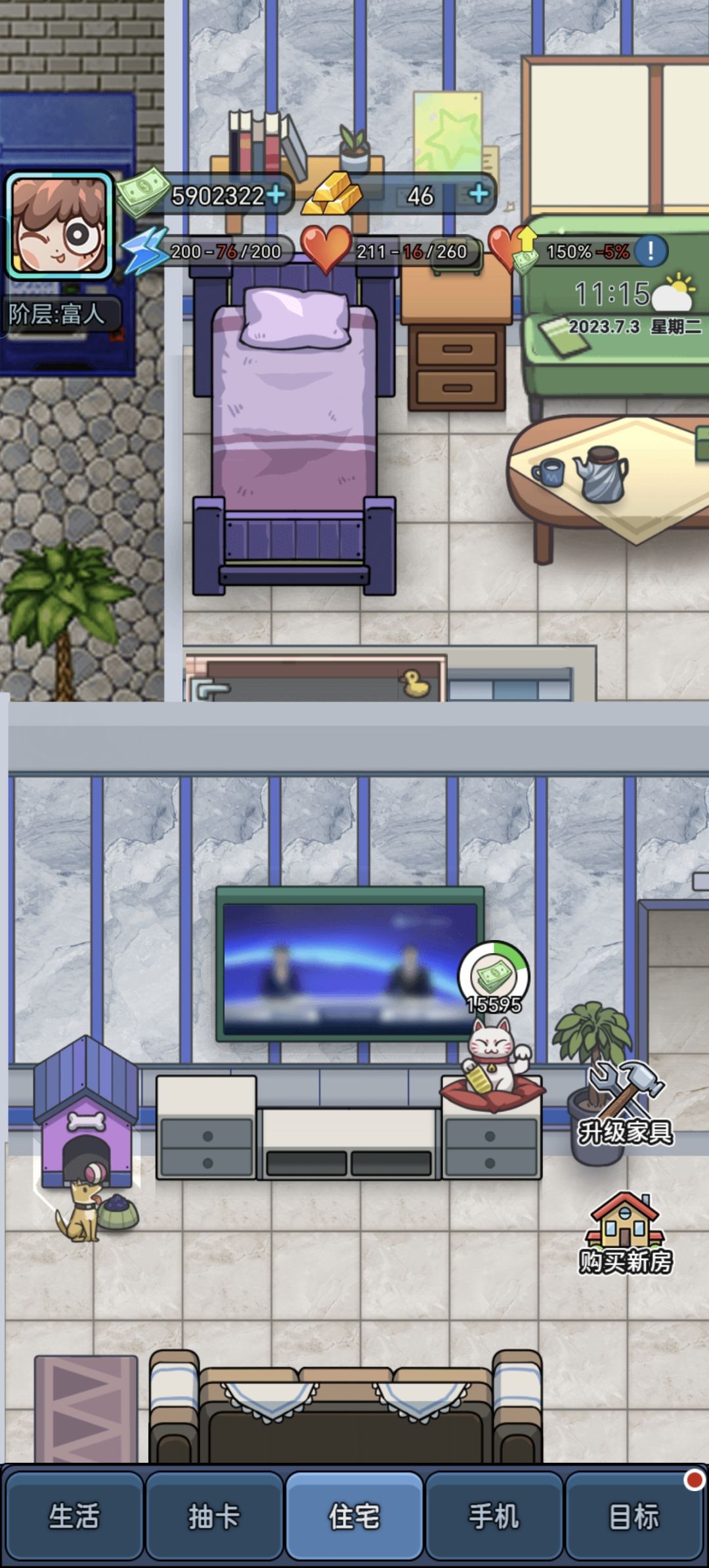 体感上来说,越到后期挣钱速度越快,前期专一谈一个女朋友即可,女朋友会上交她的工资,(就算一整天摆烂啥都不干,女朋友也按时上交工资)。阶层越高工资越高,滚雪球越来越快,感慨就是,富人挣钱效率就是高,钱足够了就要尽快买下一阶层的房子然后升级家具提高生产力,后期感觉买卖股票获得金钱的速度远高于字面上的数字的速度。买了豪宅并且家具升满以后就没有其他的游戏内容了。后面就没啥可玩的了。