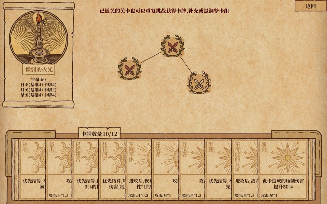 这游戏画面真是一绝!羊皮纸+壁画这风格直接拉满中世纪氛围感!卡牌种类多,星月日三种类型搭配起来蛮有意思的,AI也挺有挑战性,每个AI都有自己的套路,不会感觉重复。就是AI是真的强,经常被打爆,可能是我太菜了吧😂 另外卡牌的介绍和故事都很用心,看得出来是花了心思的,好评!喜欢卡牌对战的强烈推荐试试!
