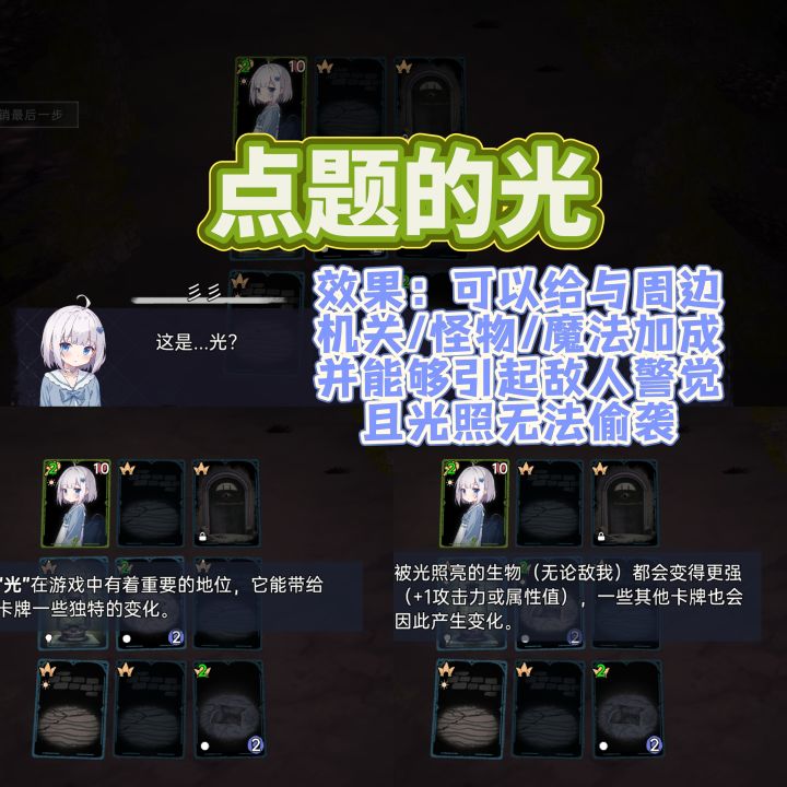 同时,光也能让相邻的怪物/技能卡/机关等通通增加一格攻击力,如何合理利用这个光,保证利益最大化,还是很看策略的。