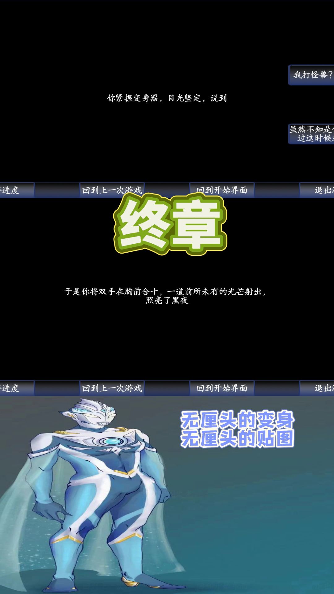 但由于这本身是剧情游戏的定位,不论是奥特曼出现的前提、还是战斗的结果,都应该配合叙事手段解说,而不该是突兀的形容、突兀的选择、最终突兀的落幕。