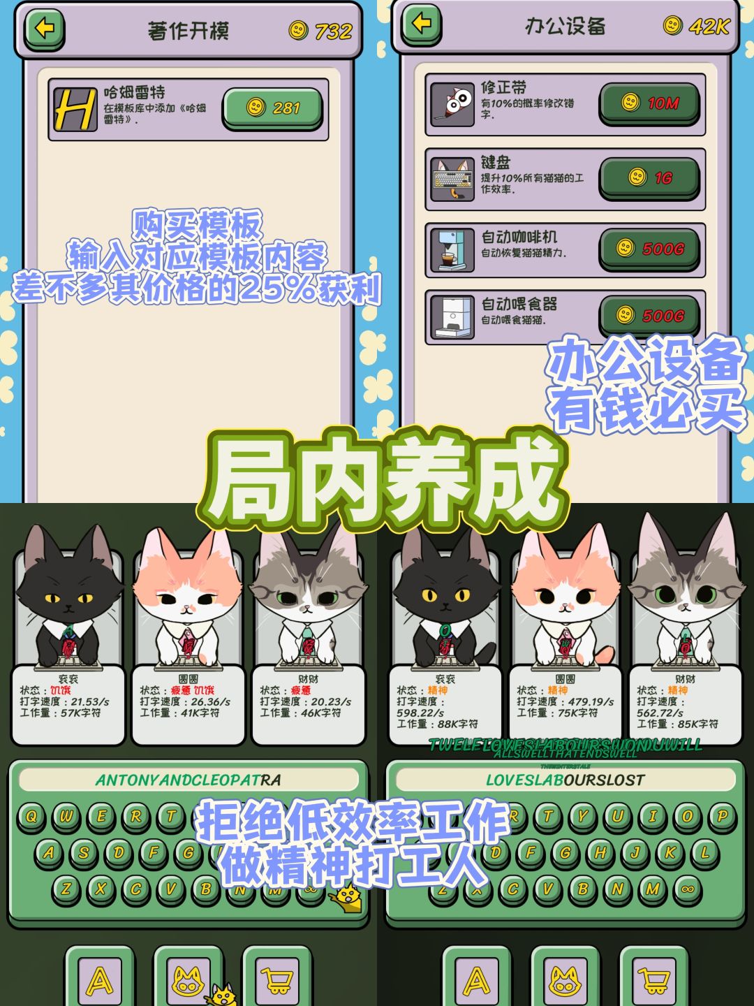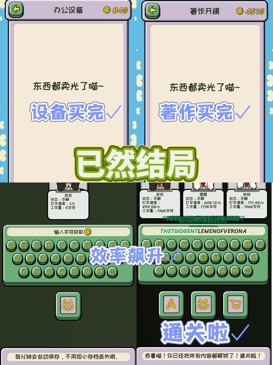而随着解锁升级,可以购入更多小猫(其实也只有三只),在码字效率上已经比玩家快了。