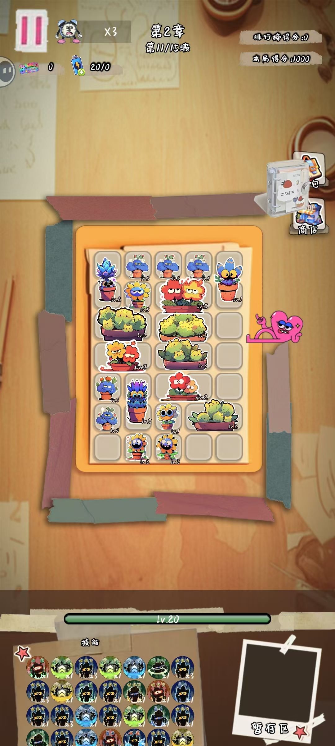 在每波的战斗中,还加入了一点肉鸽的元素。击败怪物获得经验升级后,可以在随机出来的3个升级选项中,选择一项来提升战斗力,比如增加植物的伤害、攻速、暴击率等等。