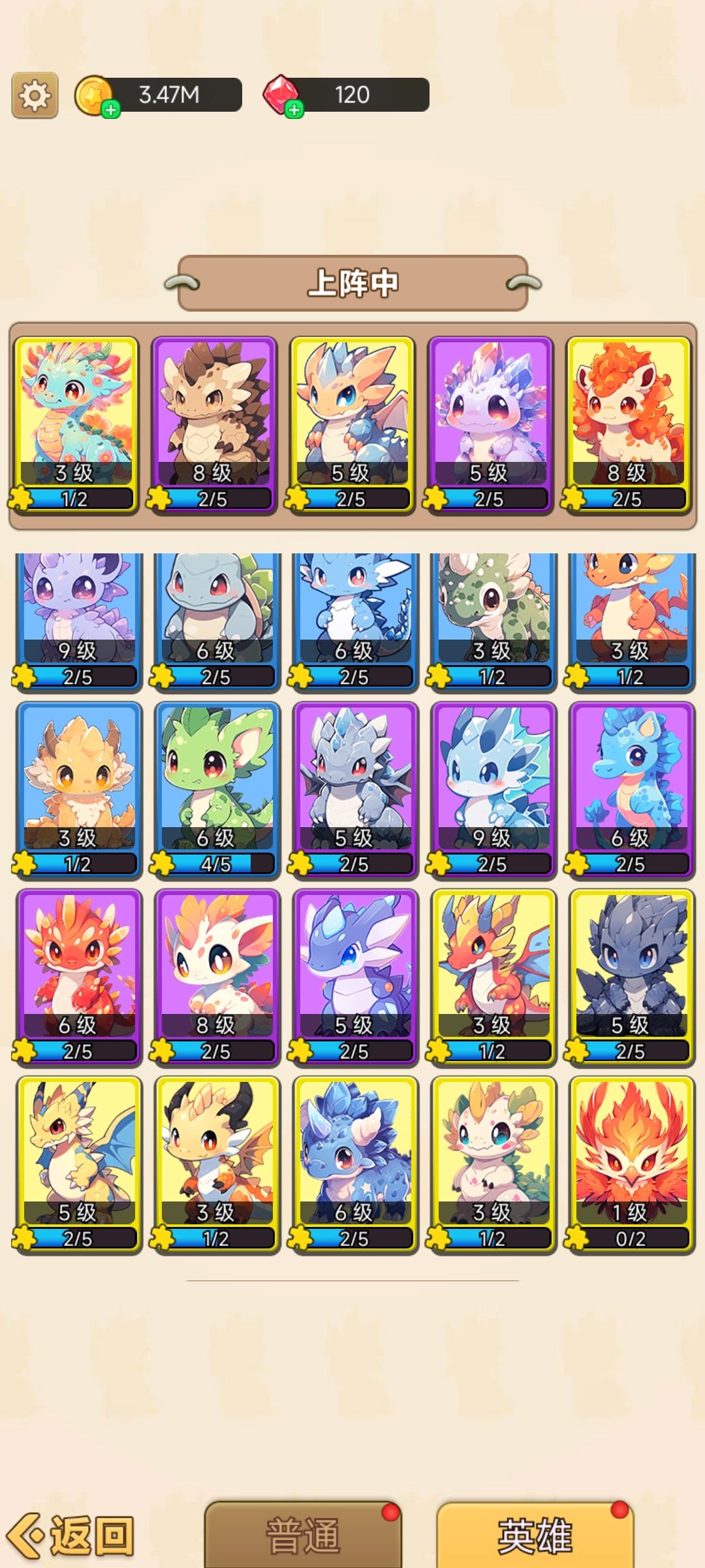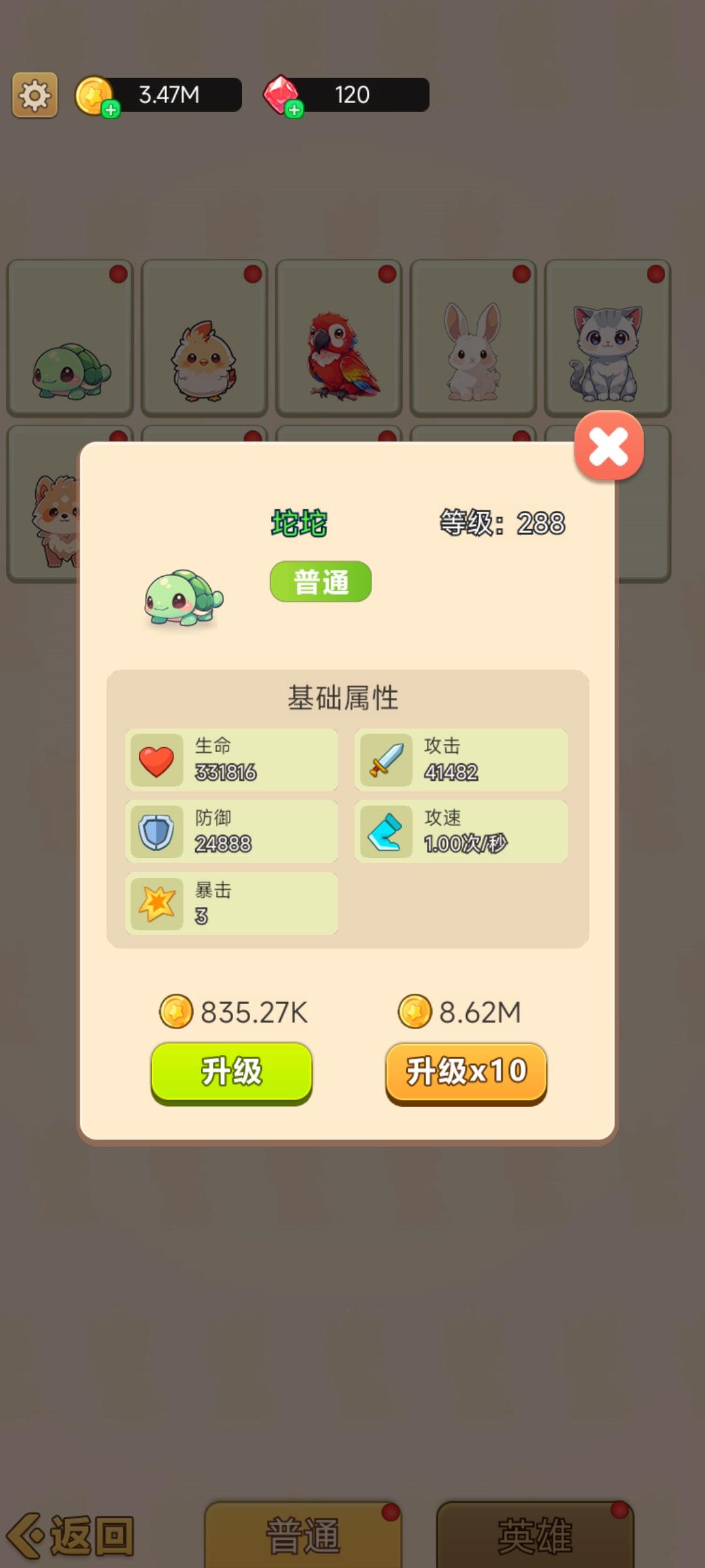 这是前期游戏后面需要更新的方面还有很多,目前是很期待的,想要推图的就单升级一个宠物我升级的乌龟能推到200后面更新了自动合成宠物才开始往龙的方向发展(本来以为自动合成看一个广告一小时啥的,没想到一个广告自动合成24小时惊艳到我了太良心了!!!)再合成又往下掉😂喜欢养成的就一点一点合成看着宠物一点点强大。