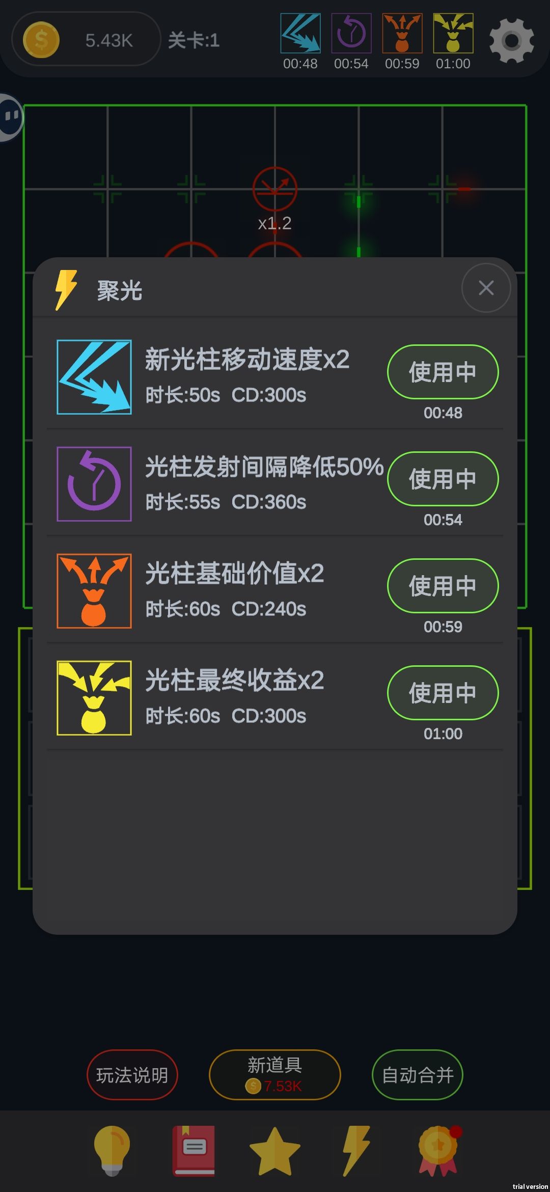 游戏中四个buff道具,分别增加基础光数值、光移动速度、光发射频率、光最终收获,但这四个道具有效期时间短,CD也并不算长。⏳