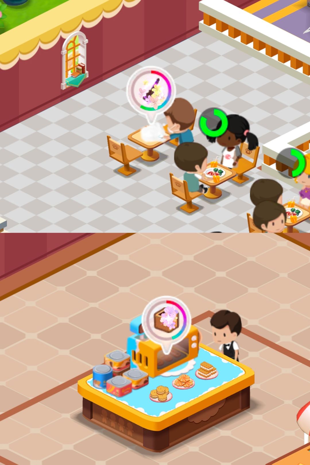 1. 抹桌子员工和补餐上架员工,头上的进度条是可以手动点击帮助他们工作加快的。
