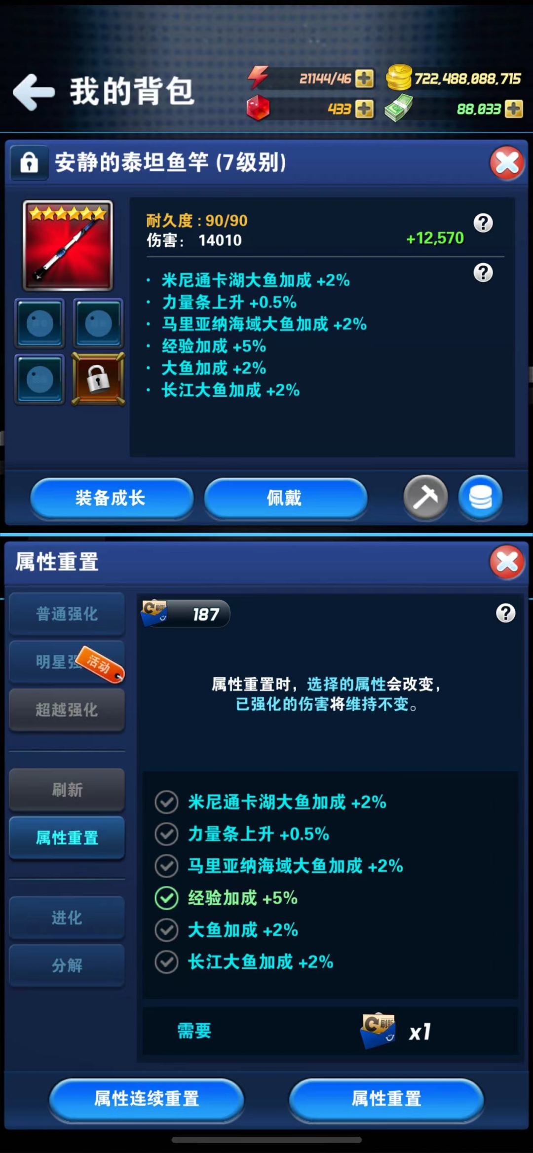 钓竿和卷线轮都有很多种类和等级(1-9级)低级杆升级高级杆等级是随机的 然后可以强化 还有词条 洗出自己想要的的词条也很难 特别是高等级鱼竿 高级鱼竿卷线轮洗属性的卷非常难获得 基本都是要花钱的白嫖获得的非常少 海神鱼竿和卷线轮以下的我就不说了太垃圾都是分解的得材料的 而只有海神鱼竿才能升级泰坦杆还能继续往上升级盖亚杆 (最终级的)这个一般玩家接触不到 泰坦杆和轮对大部分玩家来说已经是毕业 其次是饰品四种属性➕暴击伤害 暴击率 命中率 体力 手动的话加上各种活动努力刷得到的材料基本上大半年左右可以升满