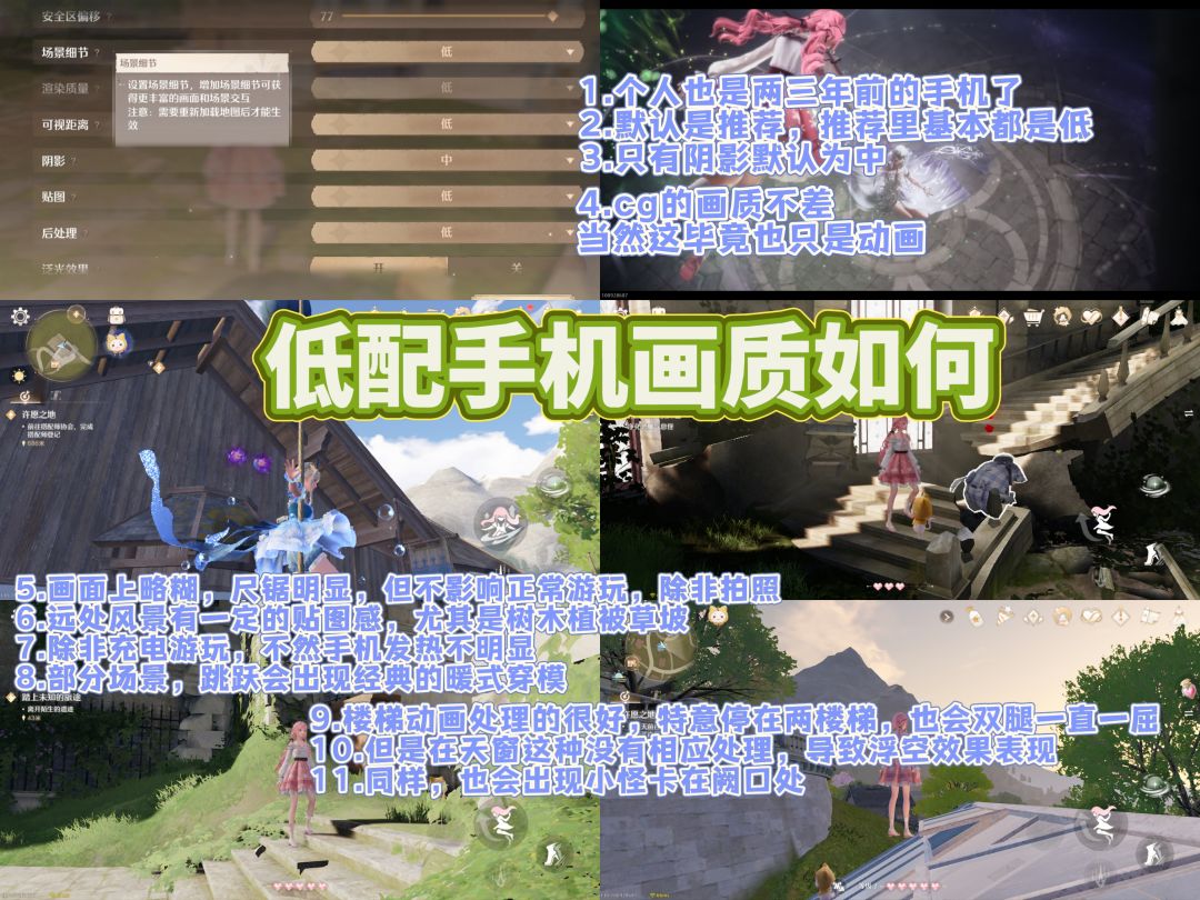 当然,个人手机在游戏里的各项画面设置也基本拉底,除了个阴影质量为中,实际表现上确实糊一些、以及近距离看(可以通过卡墙边拉距离),会有明显的尺锯感受。