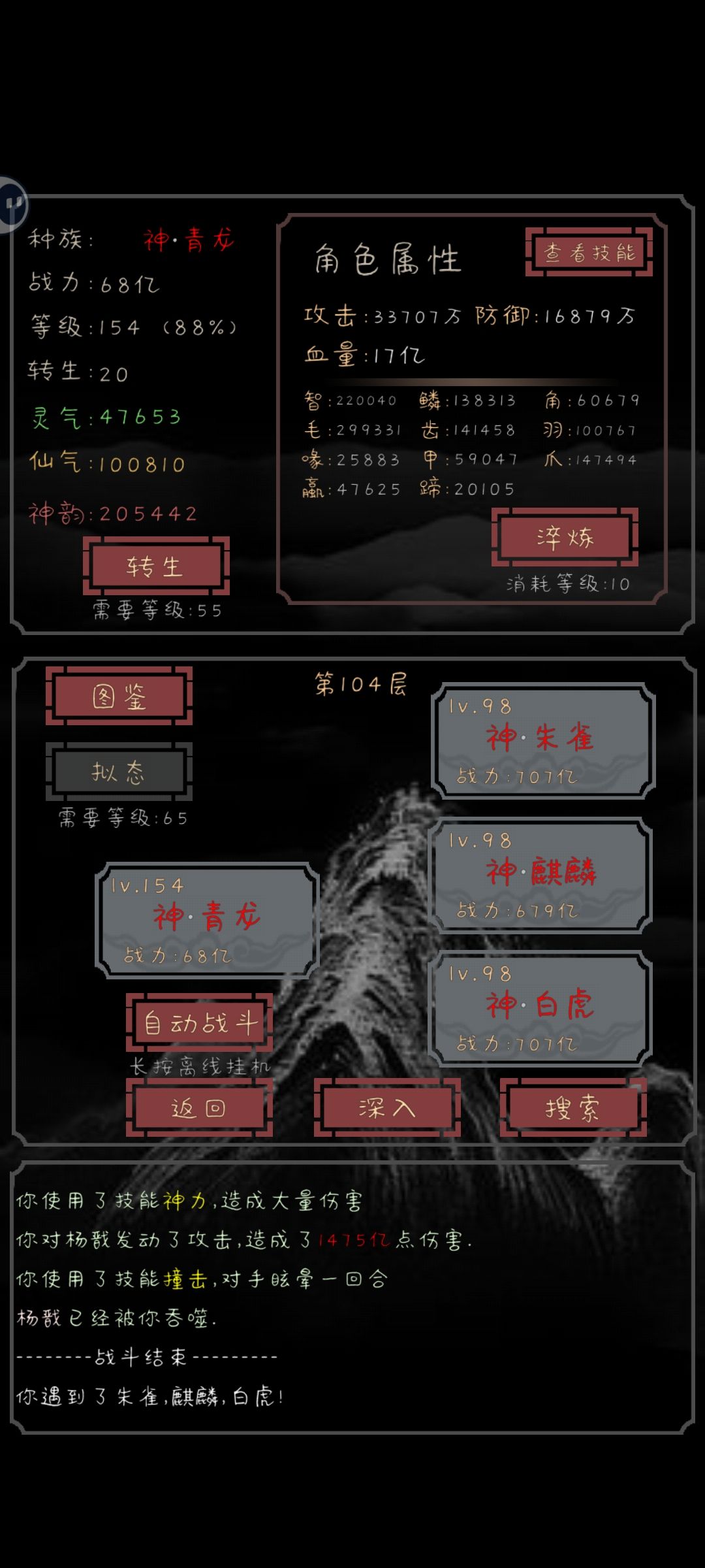 还可以,打发时间不错,知道怎么玩的话从头开始半天不到就能通关,史莱姆开局一直转生,到了转生等级就转生,一直刷能一回合秒的怪。快速升级。前面不用管技能转生10次以上。然后领取开图鉴,有百分之60会有神级图鉴解锁。然后看一次广告或者不看,反正10级就能定向,不看广告百分之5。看了广告百分之25(快速点5次看广告可以叠加概率最多五次)。然后技能,学习(人)可以增加五个技能位,推到17层左右再学。变化(石猴) 通晓(谛听,白泽) 真龙血脉(五爪金龙,青龙)。不死(黑猫,九命猫)九命(50概率复活最多九次九命猫掉)。光芒(50概率躲攻击,金乌)基本都在17层左右刷。其中通晓和变化还有真龙是最主要的。越战力打就是这几个核心技能。然后长按挂机,离线挂机一小时回来一直刷通关就行了。