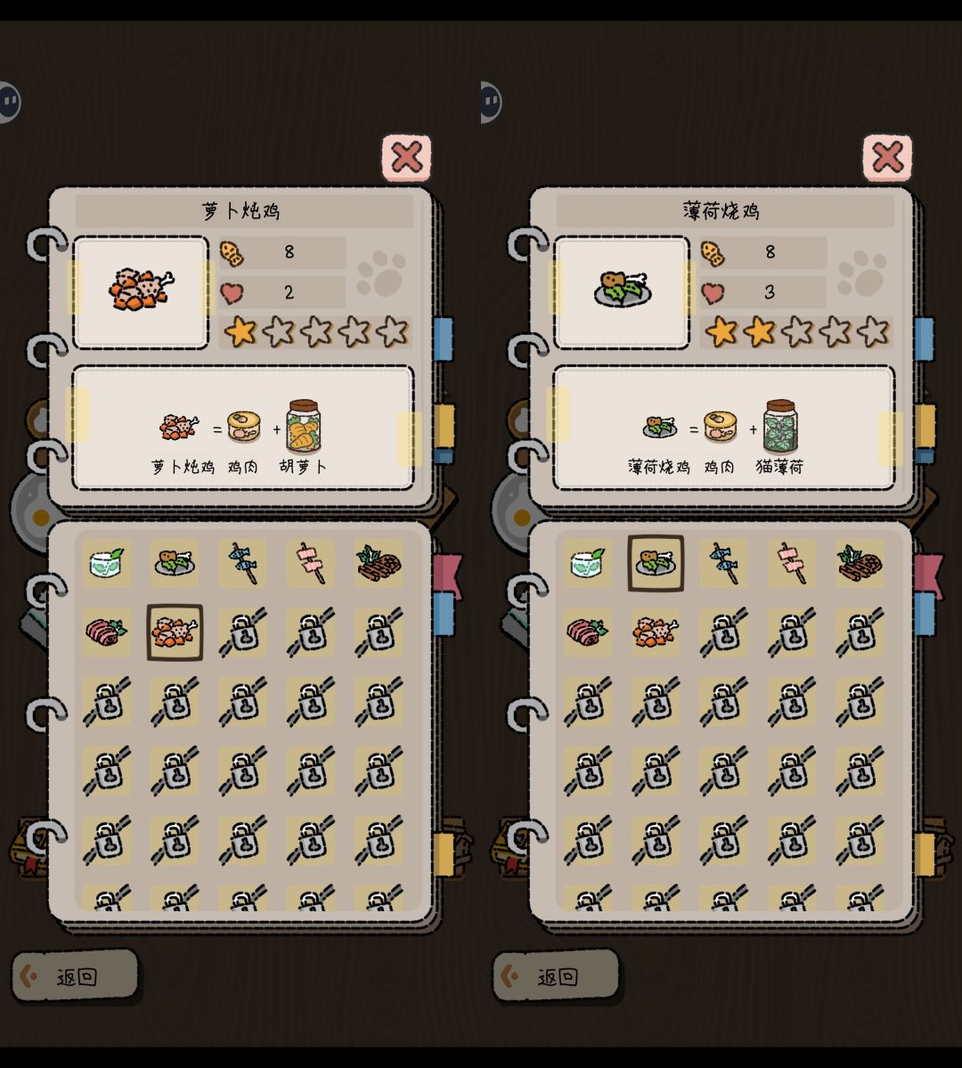突然发现自己还属于沉浸式玩家那必须来写个评价适合打法时间戳戳乐时间管理玩法 时间有点长了就记得这个了菜谱好像是要我抽卡解锁 不太喜欢我比较喜欢自己搭配 盲猜建议再整点烹饪动画过场 萝卜炖鸡就咕嘟会 薄荷烧鸡就颠会勺这种游戏最后上线都会被喊着增加个玩法我先提出来 种田啊像哪种薄荷生菜小绿叶菜 种点行再养点鱼🐟也行 小喵养鱼🐟合理总之啊 我还是非常喜欢这个游戏画风策划