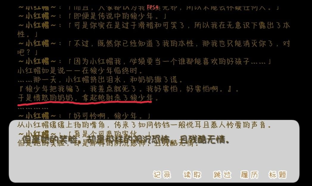 ③不同结局的奶奶和小红帽直接大变异哈,hd中小红帽和奶奶都非常温柔,标准童话主人公正派好人,阿狼遇见真奶奶的时候,奶奶没有表现很厌恶,告诫他森林里的魔物,还有说要是他不撒谎就好了,也算慈祥,而小红帽也会因为奶奶(伪)当面说阿狼坏话而确定他不是奶奶,那if end咱就不一样了,小红帽病娇就算了,奶奶直接成超雄奶奶了!?你外孙女还没死呢你给人一枪崩了?总的来说就是平行颠倒世界里的故事,咱们这个世界的奇异幻想了(毕竟童话都有了怎么能没黑童话呢bushi)