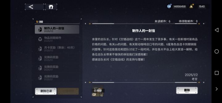 总之,作为一个很喜欢你游本身和立绘(注意嗷,游戏本身和立绘而已)的玩家来说,这个一周年过的很不愉快。本来以为你们憋了个大的,结果拉了个大的。看你们之后的处理了,我个人确实也很愿意给你们时间去试水,但是不代表你们能瞎搞。今天这个十连邮件作为纪念了,希望你们能好好对待交错战线。以上!