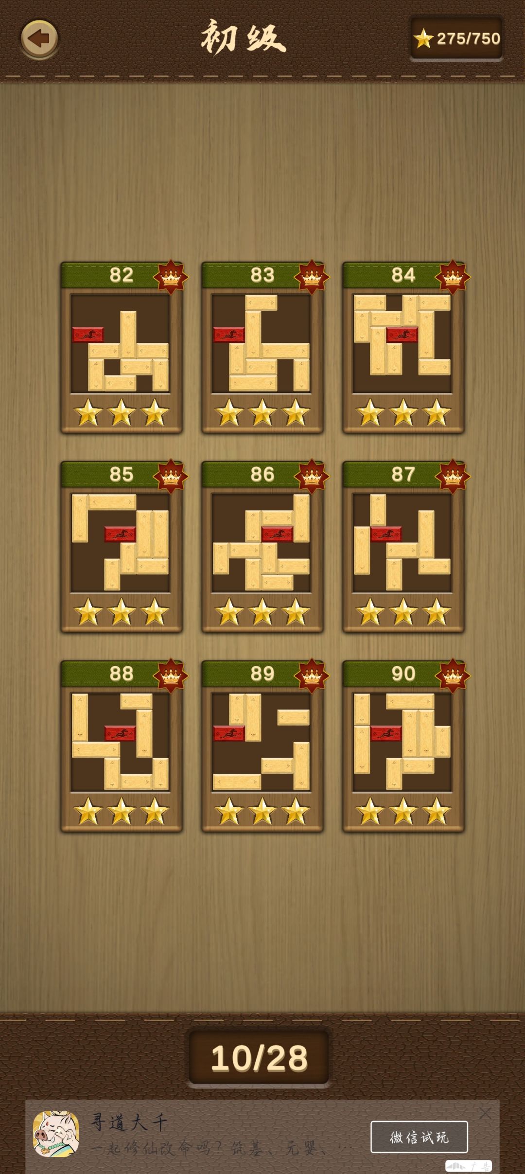 关卡数量惊人,初级就有250关,可玩性还行,但是目前初级玩多了多少会腻,可能后面会更有意思?是华容道也不是纯华容道,如图,它有方向限制底部广告非常烦人,按返回键老是误触。我发现不联网直接玩单机就不会有广告骚扰,更省心