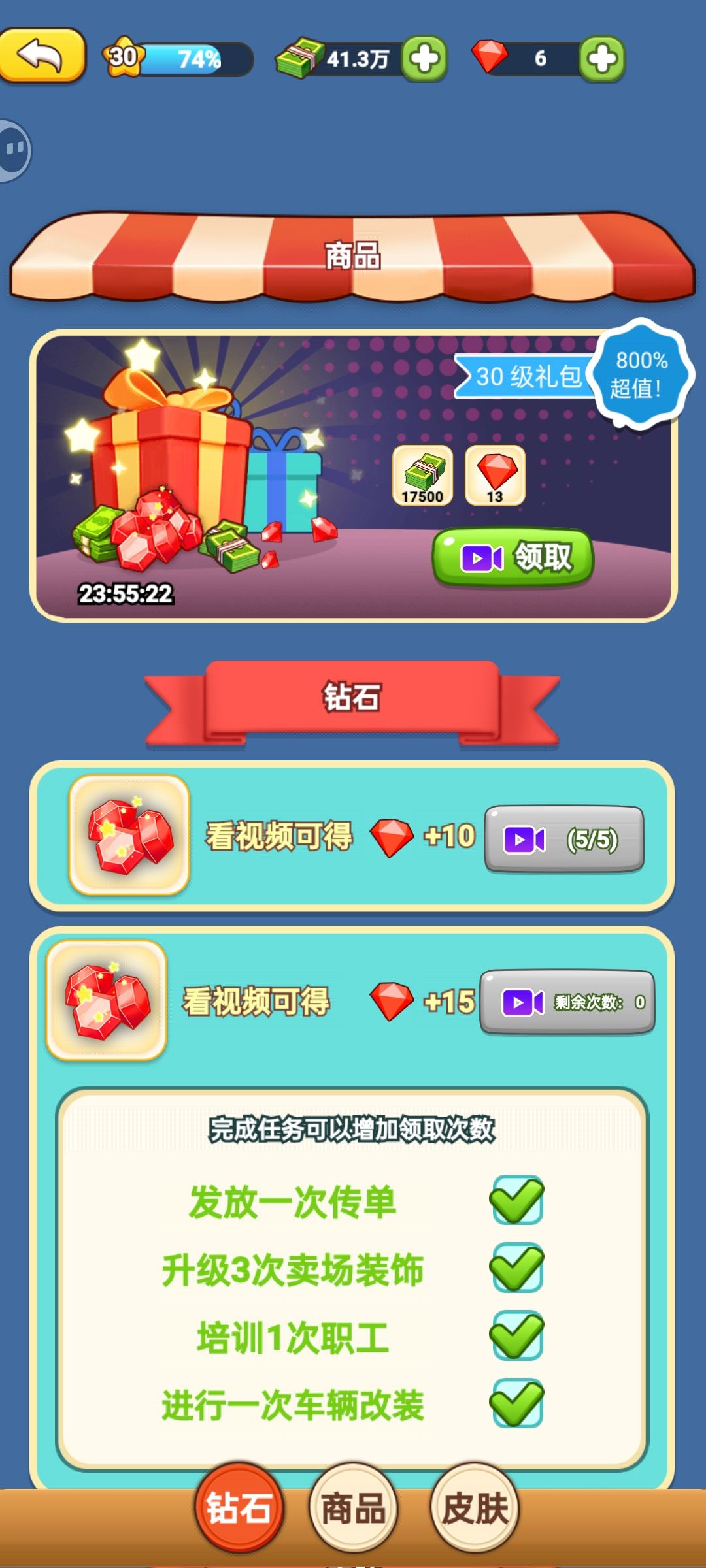 🎮可玩性:还可以,合适慢成长玩家。总结一下:没顺序☞每5级有一个礼包,后期很缺钻石💎☞拖车员一定要有,就不用老点润滑油推销员(看广告)☞地上的垃圾一定要清,不清的话人都跑光了。☞喜欢手动的推销员可以不用雇。☞客流量要先叫啦啦队长(有钻可以叫歌玛利雅)☞还在玩中......