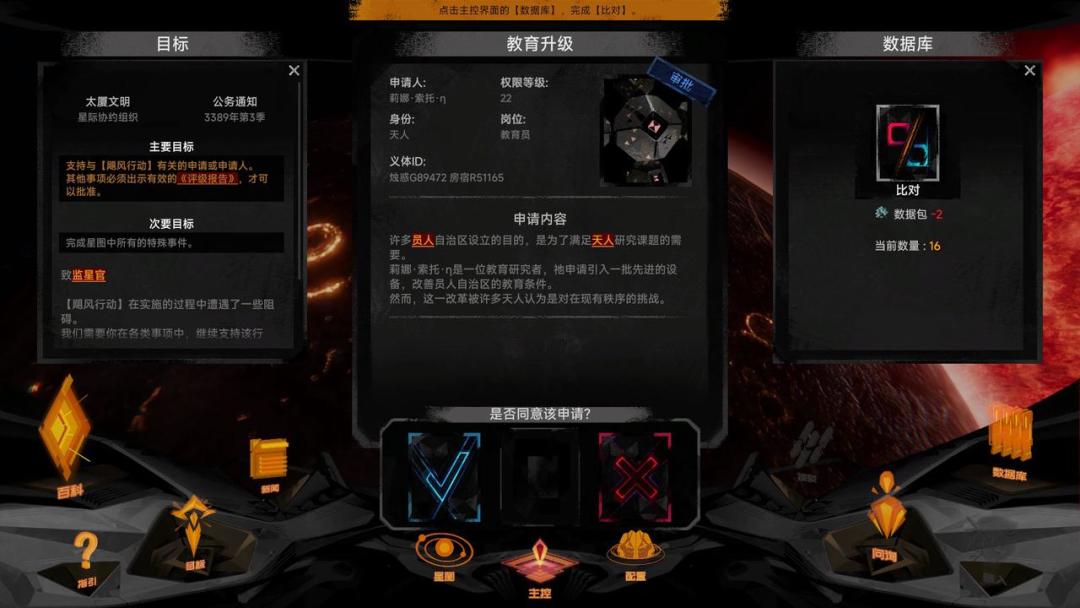 还有一类是裁决类事务,这种事务会有两个人来找主角,相当于对簿公堂,这时候我们需要选择其中一人对其进行支持,或者两个人都不支持。这时候也是需要我们通过阅读事情详情来了解哪一边更符合当下的目标、法规或者上级意志。也就是说和上面的那种事务一样,我们作为监星官也是不能凭自己的好恶来擅作决定,说白了看似大权在握的监星官其实是个工具人罢了,而这也就和剧情中的无上者控制监星官的设定对上了。