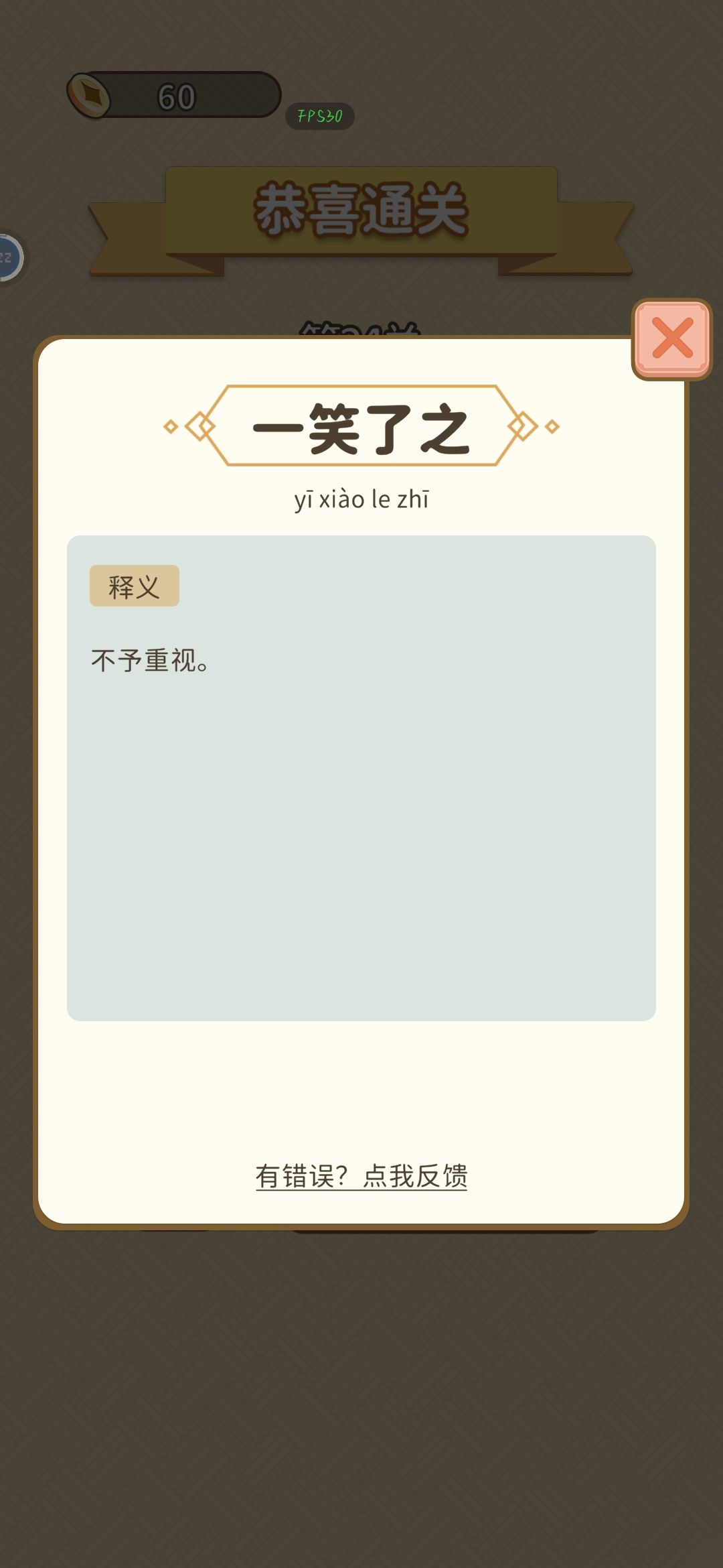 目前没玩多久还 感觉这个形式的游戏挺有意思的还是 空闲的时间挺能消磨时间 有成语解释是个亮点