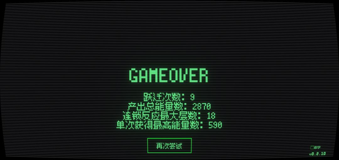 好玩,有那种电影的感觉,但真的对眼睛不友好。于是带来了不知道应该干什么的情况就看见插入插件,激活反应,看到一个格子里充满四个粒子就会合并,获取能量。能量如果有冗余,可以升级。需要获取能量超过本关所需,就会跃迁到下一个星球,否则就会失败。更新经过半小时的尝试,达到了如下成果,第9波。不知道是不是没有升级的缘故,最后一次就给了30能量。插件每次的位置是可以更换的。