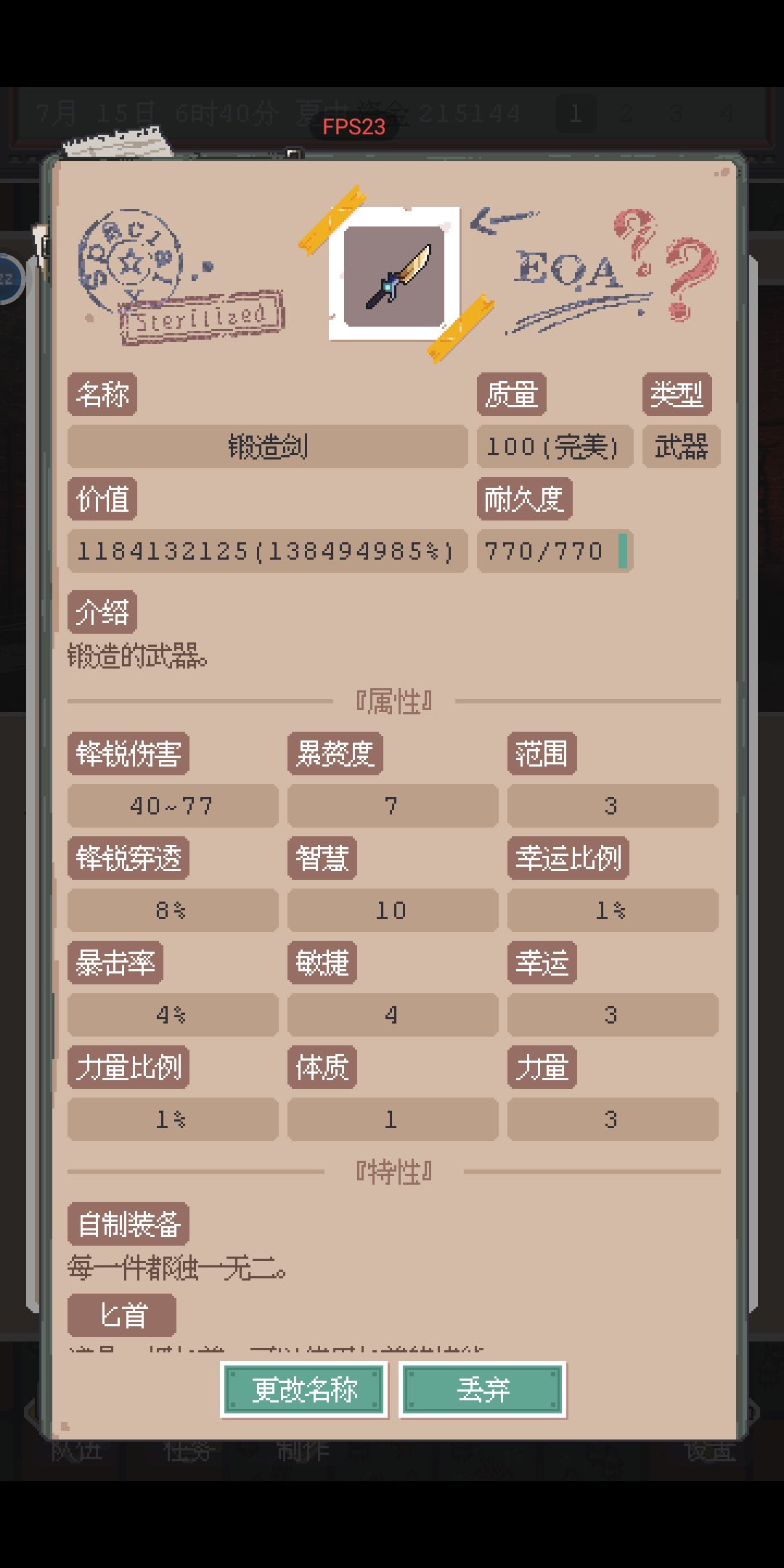 因为无聊,开始自己锻刀。锻刀的随机性让人着迷,到处挖矿分解铁碎片搞铁锭开锻。然后发现这个系统也很离谱吧,通货膨胀就在一瞬间……