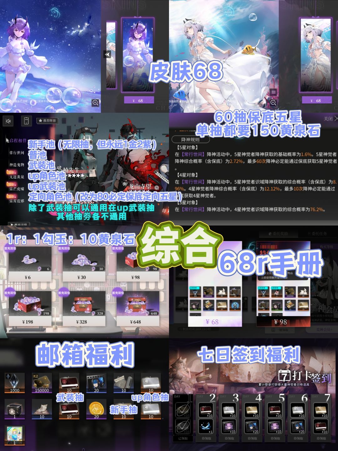 7.6r周卡是6勾+7*150石,30r月卡是30勾+30*100石还有一些零散货币和体力药剂,首充直接送六星水角“柏舟”,68r的手册也有;