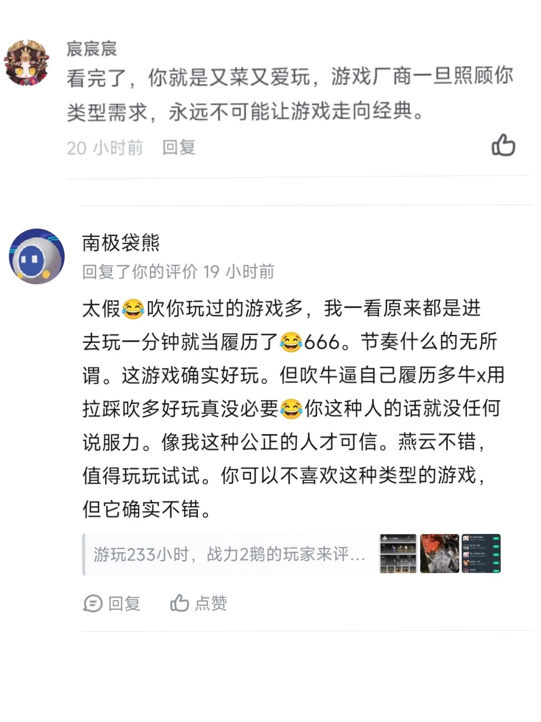 【五编】:引战的评论意义何在呢?合理怀疑是水军哈,一个游戏不指出来他的问题,那这个游戏很快就凉了。我指出问题也是想让游戏更好,大家都是实实在在的玩过这个游戏的人,有问题凭什么不能说出来?更何况我说的问题是大部分人都说过的吧,有些人真的是意义不明哈😃我说过了吧,春天的竹子别来沾边