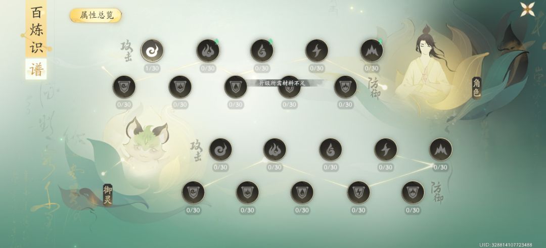 简单的理解就是比较通用的技能树加点,每个点位如图所示都能升级三十次。第一次升级消耗一个材料,二级的时候就消耗两个……