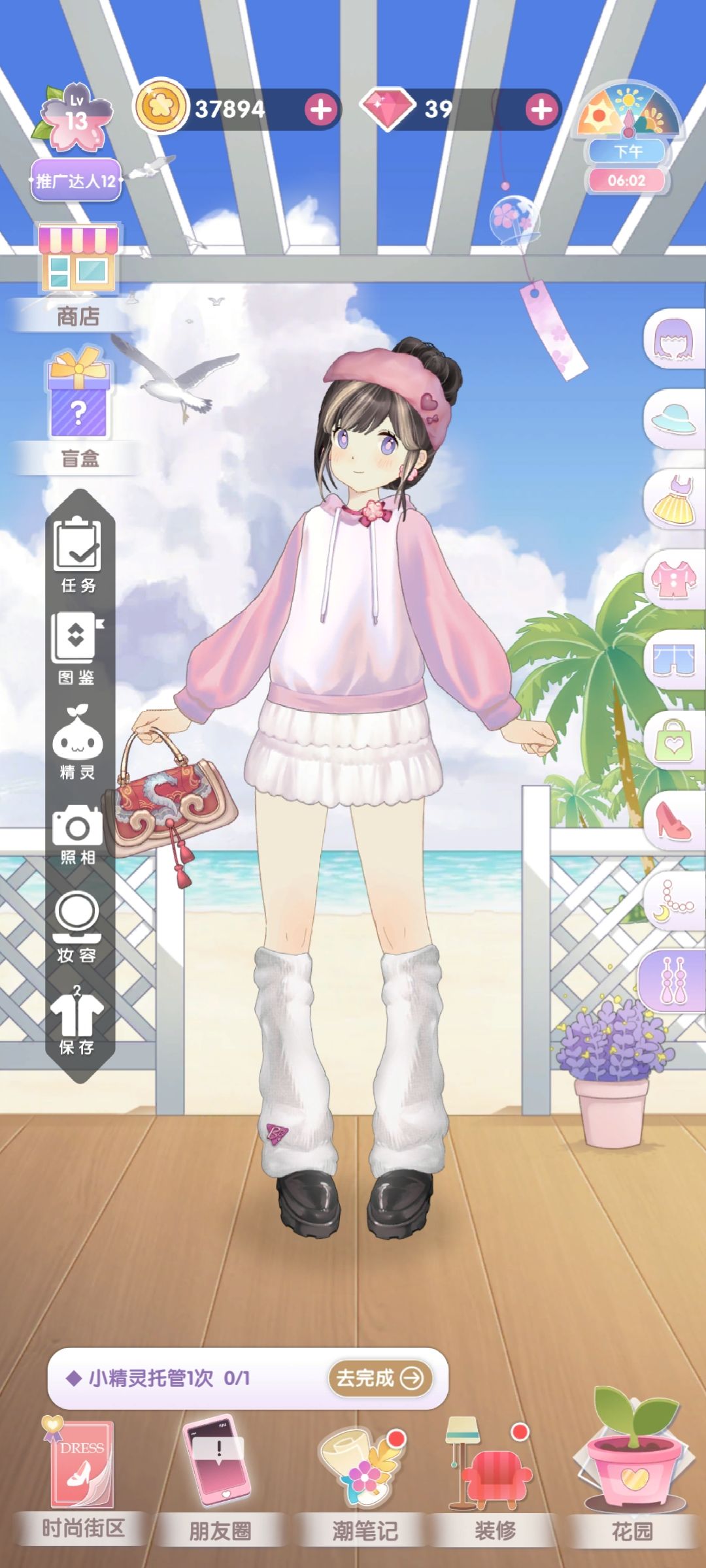 玩法是种花获得衣服,有概率不获得但有保底机制;可以和npc互动,但是每日只有十次获得好感次数而且互动不自由;里面有连连看可以获得制作房间饰品的材料;无氪金渠道,但是广告看不了,小精灵托管任务一直做不了,盲盒也抽不了就挺难受的