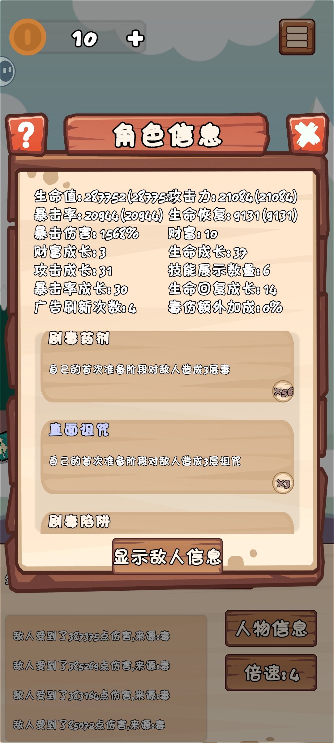 玩了一千多关了,基本上开局直接秒对面,开始我还以为是那个3%的毒反的功劳,结果发现差不多150层毒就可以直接秒掉对手,而且我还没有买那个加毒伤的遗物,没有算过,不知道为什么这个毒的伤害怎么高。😃只能说打发时间挺有意思的。
