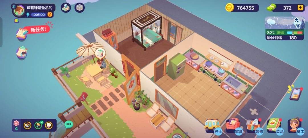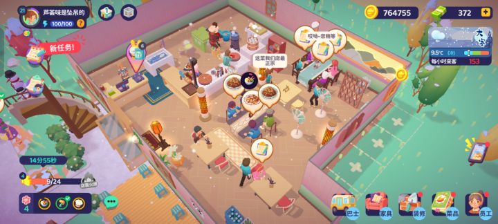 1.3d模拟经营,有点类似于之前玩的一些打发时间数值无限膨胀的小游戏(弹窗经常会出来的那种)。这种立体感是很好的,包括游戏里的角色是真的会到指定地点上菜做菜的。