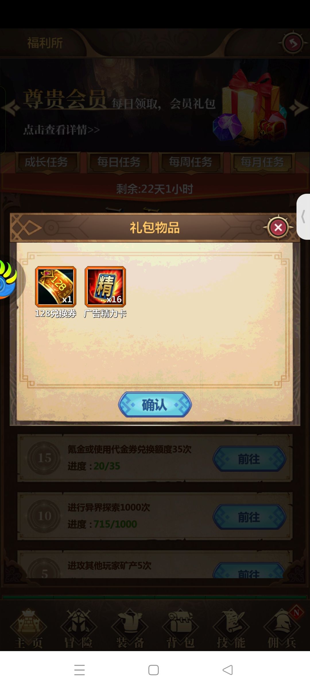 玩了半个月了,过来评价一下,这个暗黑风是我喜欢的类型,其次就是对白嫖玩家相当友好,只需要开个免广告,那么代金券,就可以夸夸的领,我这里就开了一个月卡,免广告卡,就可以玩的很不错。无论是氪金,还是白嫖,都可以有很好的体验。玩法也很多样化,里边有很多代金券,可以顶真实充值,有图有真相,不过每次只能上传三张,其它图片就不全部例举了。也有很多新手活动,不用充值也可以做的那种