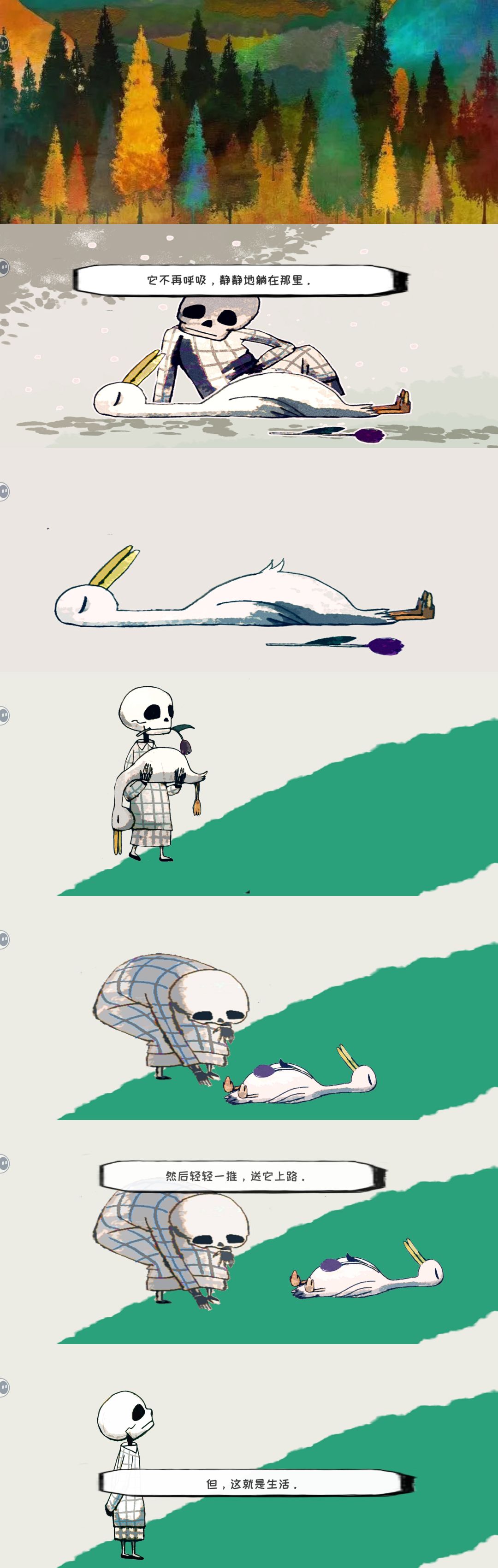 评分:4分哈哈哈哈超级简单超短小的一个小游戏,像是看了一个很简短的绘本,淡淡的忧伤和温馨,总感觉创作团队很活宝啊鸭子和死神的故事,这个死神也不恐怖,看起来就像鸭子的朋友一样,他也有害怕的东西,也会和鸭子一起玩耍,陪着鸭子,最后把他送走鸭子似乎没什么朋友,和死神一起梳毛,吃鱼,晒太阳,最后死在寒冷的雪里死神小心翼翼地把鸭子放在水里飘走,死亡就是这样,虽然平常,普通,大家都明白这个道理,但是留下来的人还是会忧伤