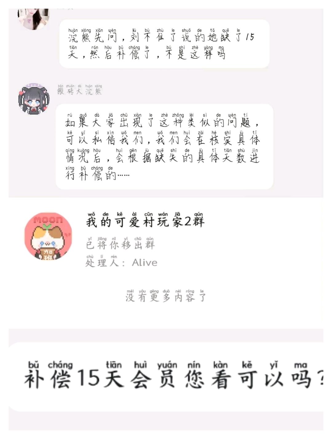 把玩家踢出群,仗着人家看不到,开始胡编乱造,明明是你自己说补偿15天,扭曲成玩家自己说,编造事实你是最牛的。感觉你意见很大呢,这句话我还给你老a😸