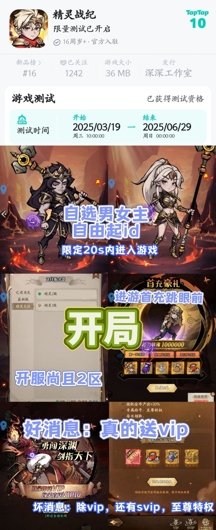本作《精灵战纪》的vip、与其说是特权类等级,不如说是阶段性赠礼,最高通关到50关可送vip10(500钻石和碎片素材),同时解锁svip;而至尊特权1级就需要18r才能解锁,给予战力数值称号、藏品一键升级、每日领取1000钻石等特权。