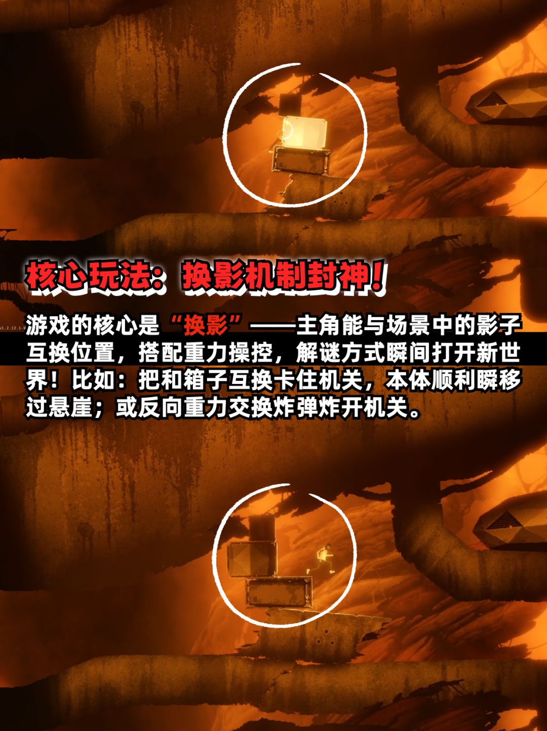 游戏的核心是“换影”——主角能与场景中的影子互换位置,搭配重力操控,解谜方式瞬间打开新世界!和箱子互换卡住机关,本体顺利瞬移过悬崖;或反向重力交换炸弹炸开机关。初期有时候会迷失方向,后期熟练后那就是一个行云流水,爽到停不下来!🎉