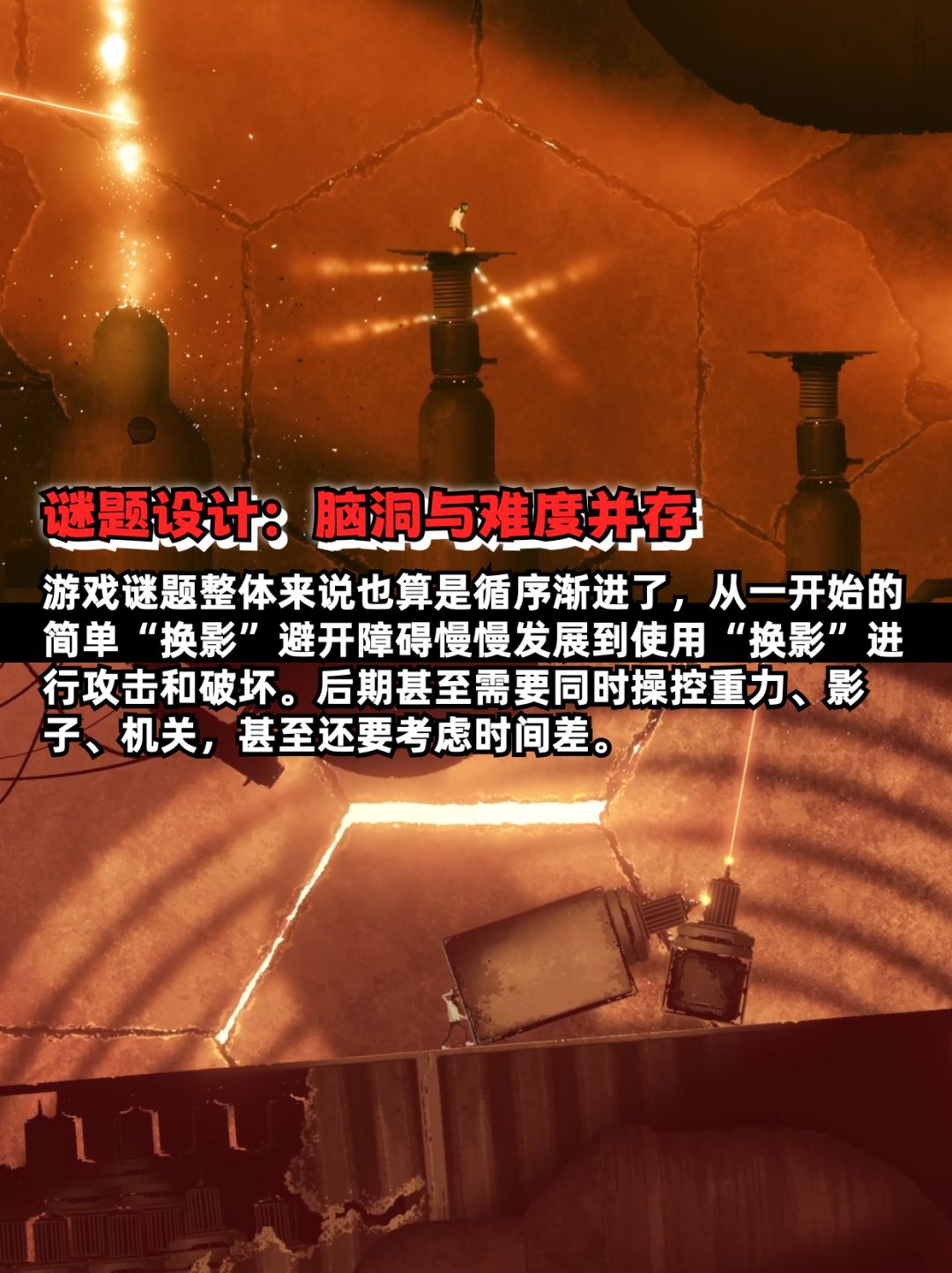 游戏谜题整体来说也算是循序渐进了,从一开始的简单“换影”避开障碍慢慢发展到使用“换影”进行攻击和破坏。后期甚至需要同时操控重力、影子、机关,甚至还要考虑时间差。如果遇到卡关,个人建议可以先去做点别的事情休息一下,说不定再回来找到了节奏一下就过关了。当然,解开后的成就感也会直接爆棚!😭