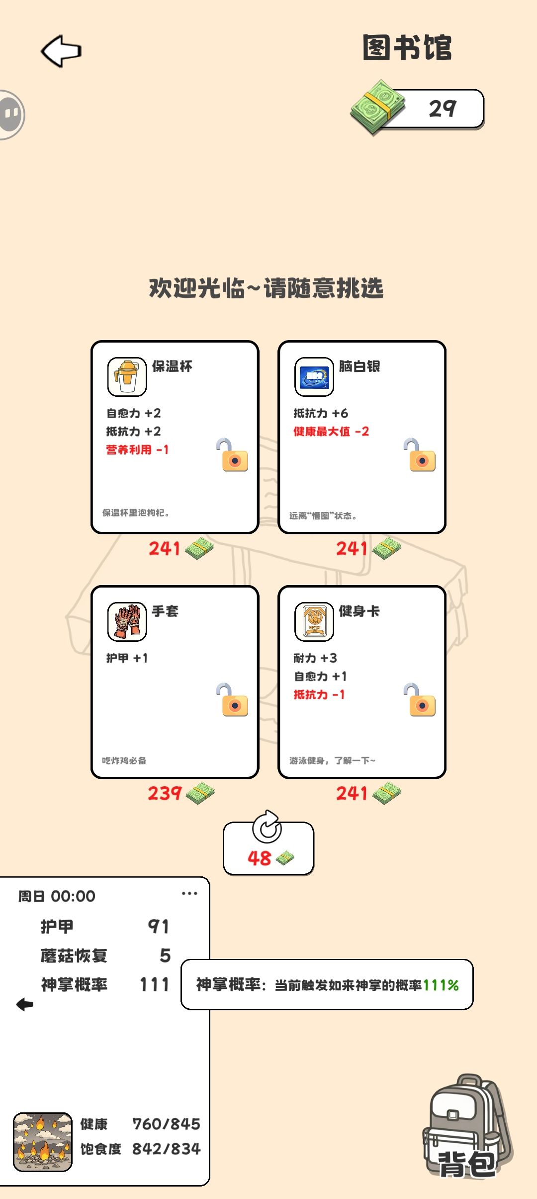 ③有一个地方可以回饥饿,第一个回20,第二个回50(这两个都要广告)