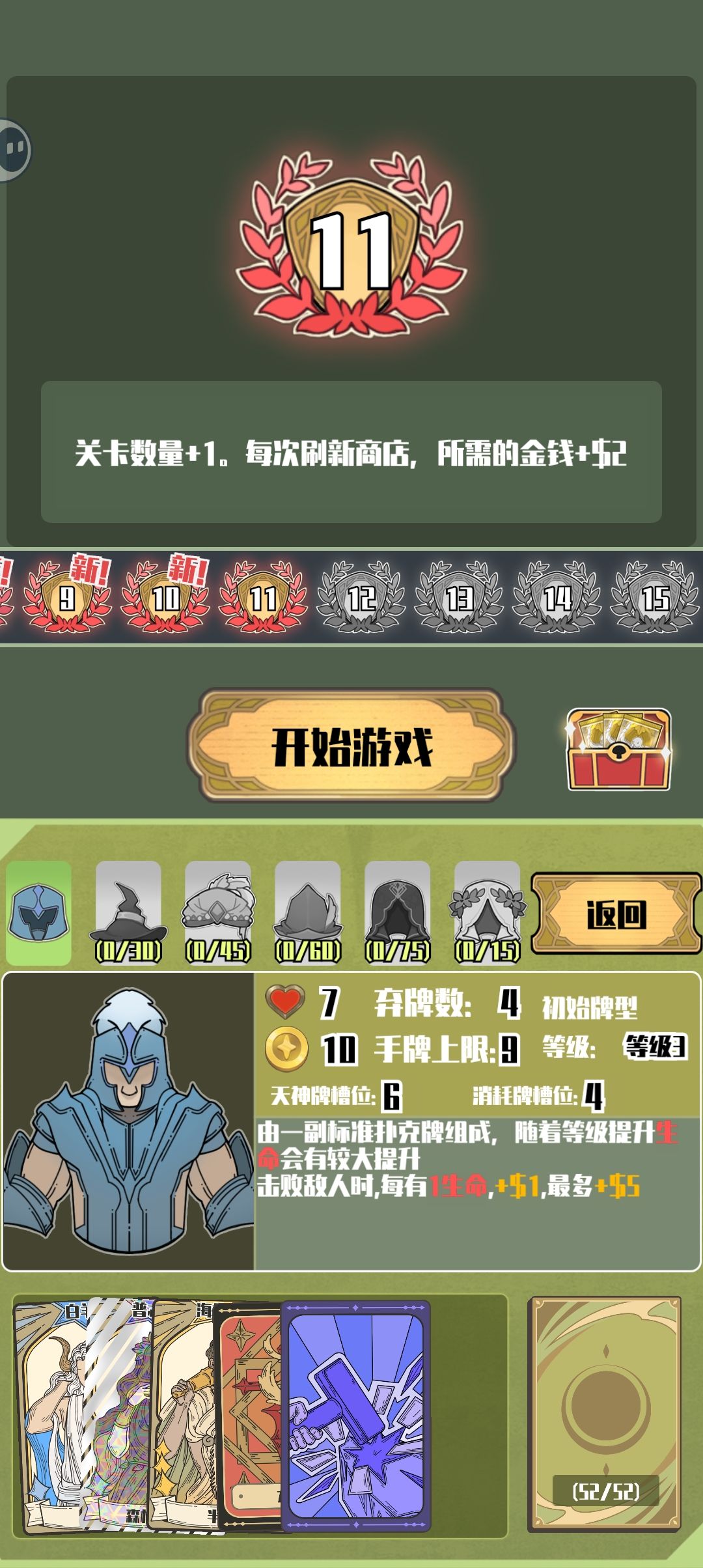 美术风格是希腊神话风,玩法以各套扑克牌之间不同倍率砝码为主,添加各种肉鸽元素,天神牌作为辅助牌拥有后作为一种常驻伙伴提供增益,魔法牌功效不等,大部分都是为扑克牌添加附魔效果。这个附魔效果很有意思啊,各种附魔有各种不同的效果,个人觉得最🐮的还是隐匿,遇到隐匿必买,只要拿到3星可以给牌附魔的女神后面就是平推,全部重复刷隐匿,不是隐匿的一二星卡直接卖,留卡位给三星,后期三星卡多了直接卖三星卡就行了,三星也能刷成隐匿,但是比较看脸。加倍率必拿,个人推荐优先三条葫芦同花,都是比较好整的(本来就花不了多少钱推荐遇见全拿)魔法牌比较能整,一个角色根据牌价值给金币,一个是给一半金币,魔法师,收货和成长,都是收益很大的牌,尤其是一张可以给前一张用过的牌,可以跟魔法师之类的牌小循环一下感觉还是很爽的,其他什么给牌附魔什么的基本不用管,可以拿毁1送4(应该是送4?),商店会有降价商品遇见都可以拿拿就当是送的,前期没钱不要刷新商店,后期随意,这个游戏还是不怎么能堆经济。