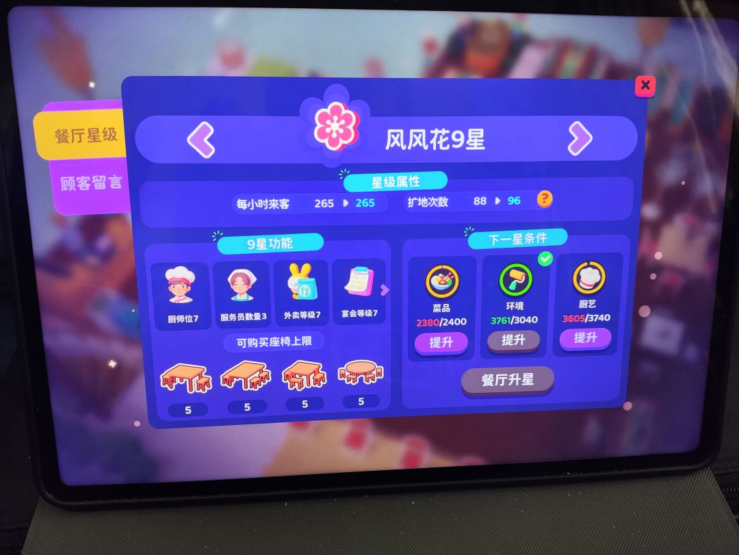 这游戏氪金的优势在于,你可以比别人快很多升级餐厅星级,从而快速玩到后面的内容,因为你可以氪金得橙色厨师,橙色家具,菜品,这三个是升级餐厅星级的必须属性。