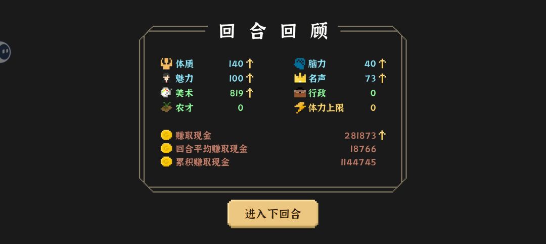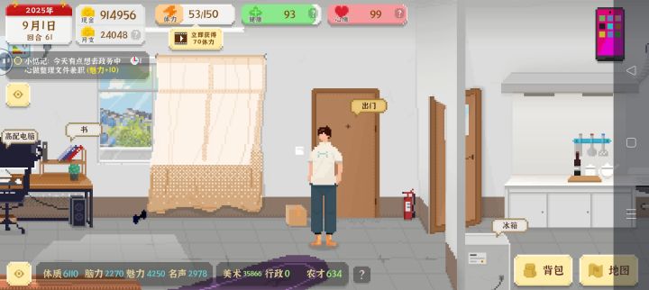 解锁高中后,可以去椅子上休息,坐双杠,健康不够就打篮球,因为篮球加的健康多,还有小卖部买零食,然后点外卖和奶茶,每天都吃+3的药,设计转了点钱后可以去集市家居那买个床加健康,大哥找我借钱的时候钱不够没借,钱成负的时候就去接商业设计,钱稍微多一些的时候可以租写字楼,我招了两个初级员工,找员工后要是还有钱可以去买1500的插件或过几个回合。差不多这个时候家里需要五万,然后网购买个冰箱,再去集市把家居都买了。我是去一次集市就卖废品,然后去美老板那买一个公仔,买公仔那个是随意,因为靠聊天也能把好感聊满。晚上不睡觉,开始是加美术的点两个,加体质的点一个,再点一个加魅力的后期体质和脑力差太多就把跳本草纲目换成玩手机。