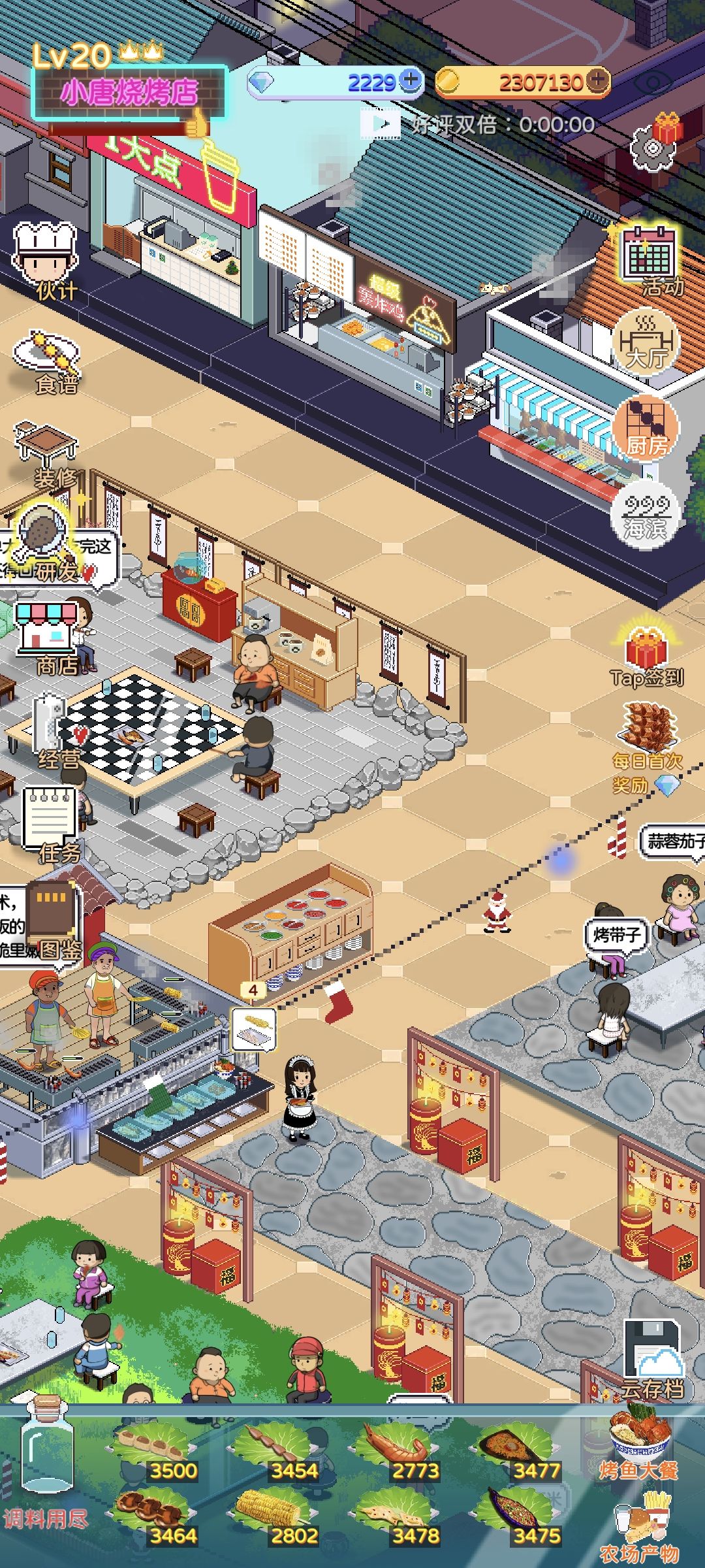 有一说一,有二说二,真挺好玩的,我也是跟着攻略玩的。反正一定要先开海滨,前期肯定会有烤串儿不够用的,到后面就好了,我现在每天沉浸钓鱼无法自拔,很期待每次钓到什么鱼,这个经营类游戏包括挺多的,包括了农场啊,种地呀,奶茶呀,炸鸡呀,烤鱼啊,烧烤啊什么的,我觉得挺不错的,我之前我是绝对不会看广告的,玩完了之后觉得看看广告也没什么。
