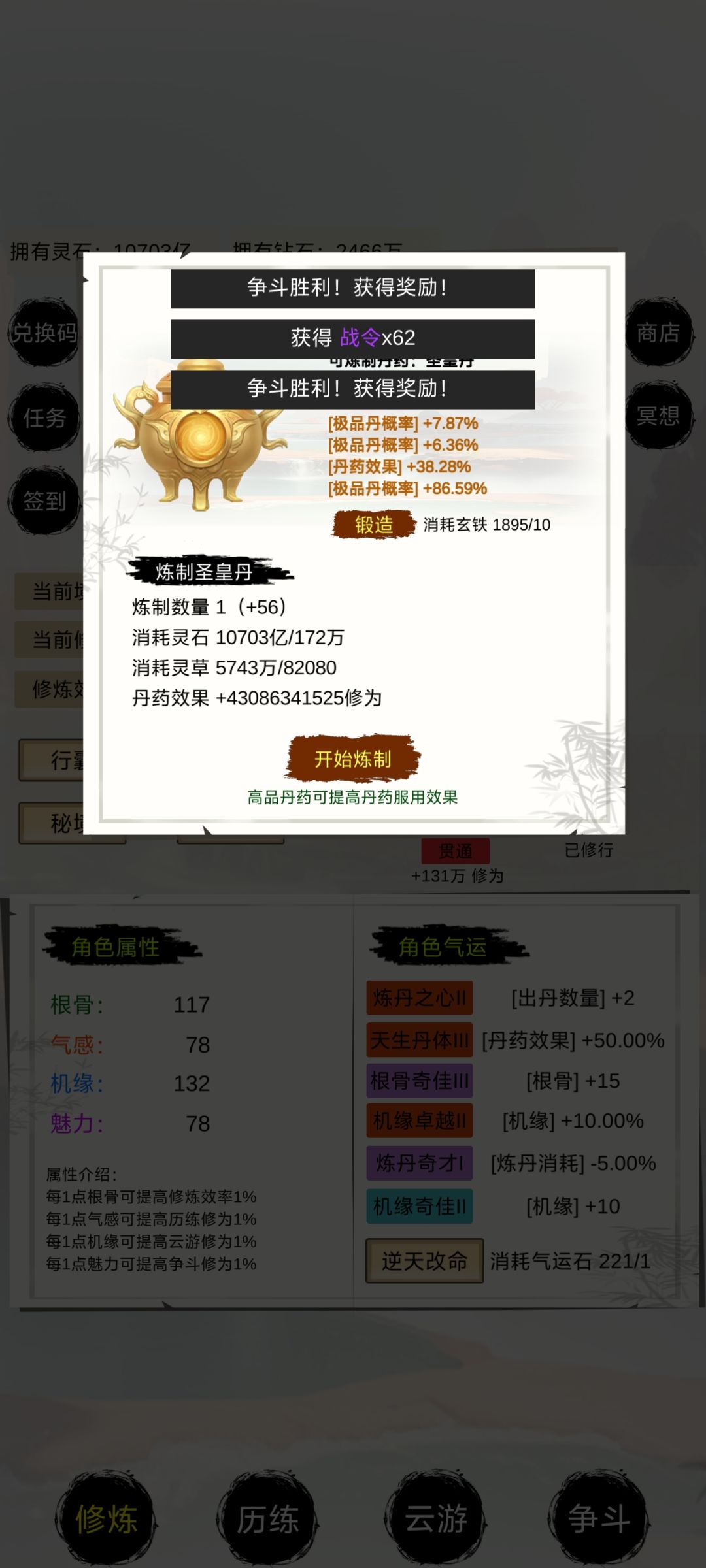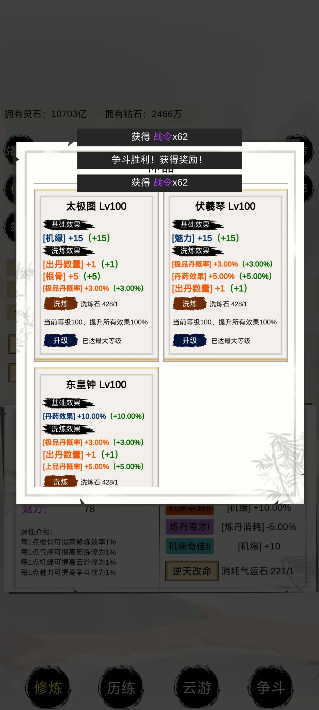 怎么说呢,玩法不多,也就提升境界,有点意思。提升境界,吃丹药就OK,神器洗练可以,增加丹药数量