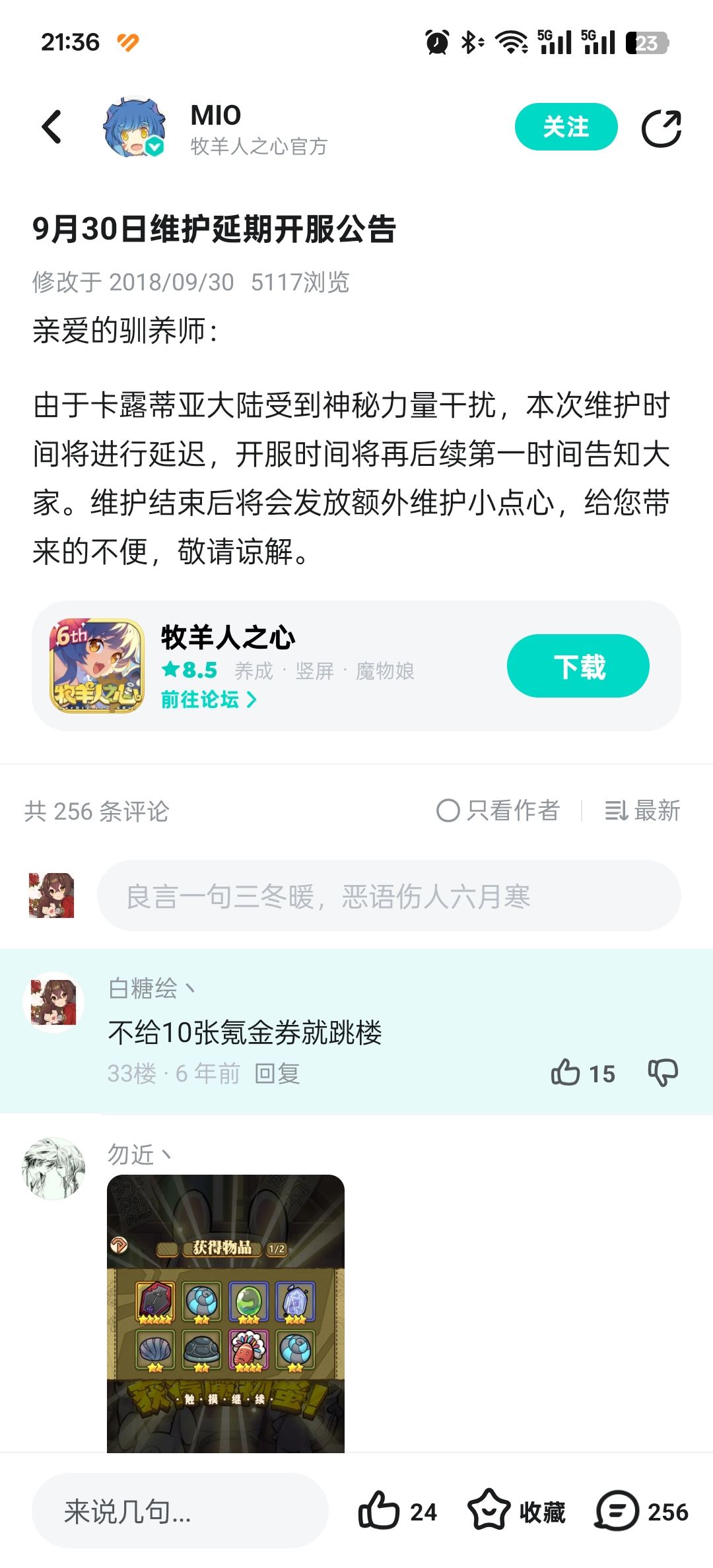 (翻taptap还看到了自己当年发的评论,不知道现在羊油每次更新开服还会延迟吗)