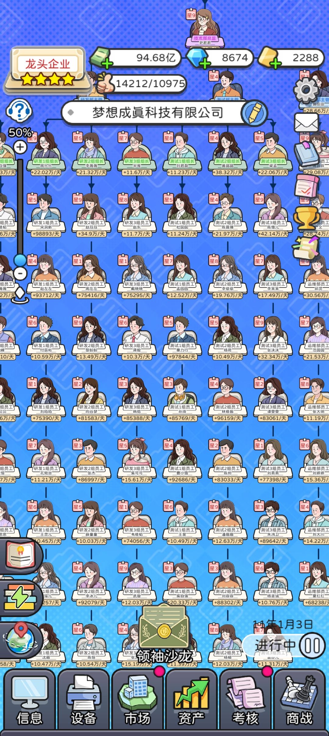 9部门每个8项,一个部门升满10.7787亿,所有部门97.00848亿。前期只需要升级业务部,中期升董事长,整体来说就是提供爽感,后期拉满。