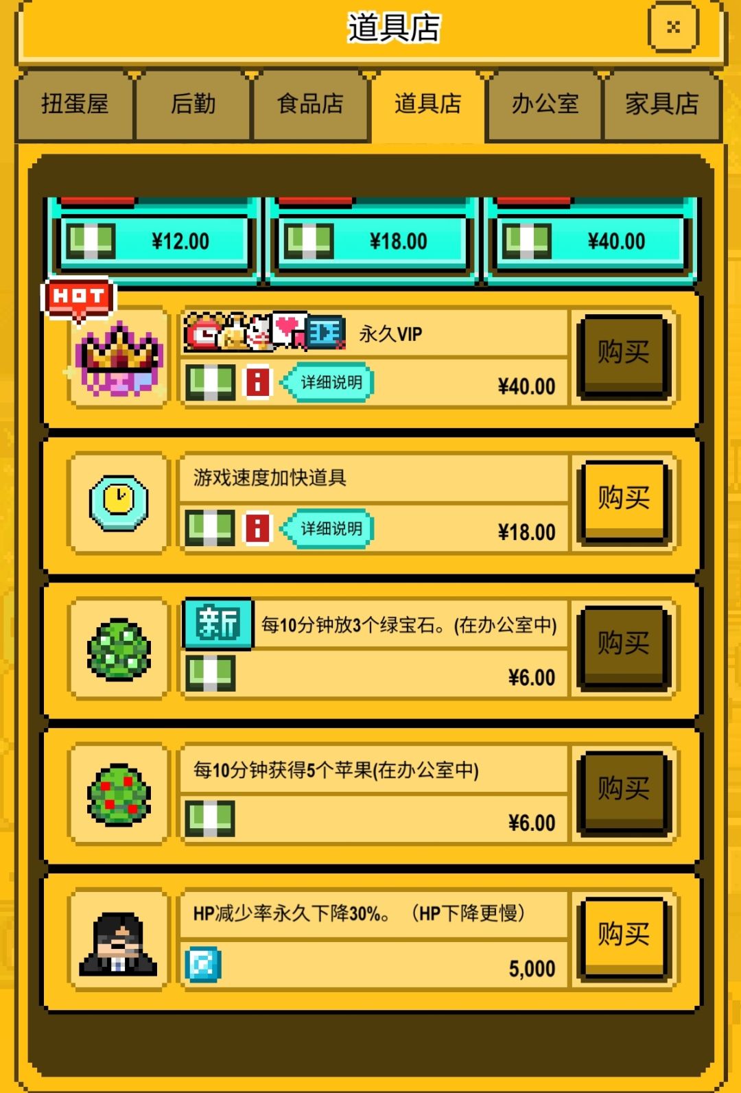 氪金方面,我只氪了个VIP,苹果树和绿宝石树,个人觉得这三个氪了比较值,时间加速那个我觉得比较鸡肋,主要是到后期你会觉得特别卡,时间加速就用不上了。
