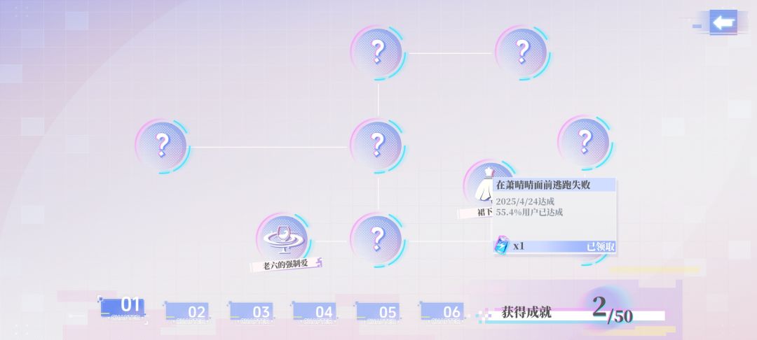 目前五名角色,每个角色五个故事,但看首屏加载有六人,可能作为隐藏内容出现。另有收集成就功能,总数50个,可能要把所有分支都走完才能凑齐。