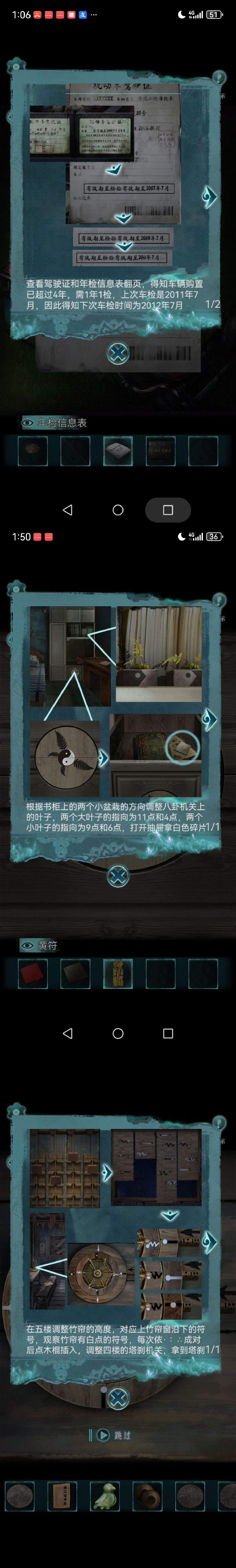 1、第三章摩托车密码是201207,但是就凭驾驶证和年检真的很难联想到,我觉得少了一些有关答案动向的暗示。我是看了提示的说明才知道这个谜题的规则,超过四年,一年一次,所以是让玩家输入下一次年检时间。但我个人认为吧,凭这两个线索很难联想到。(下面有图片)